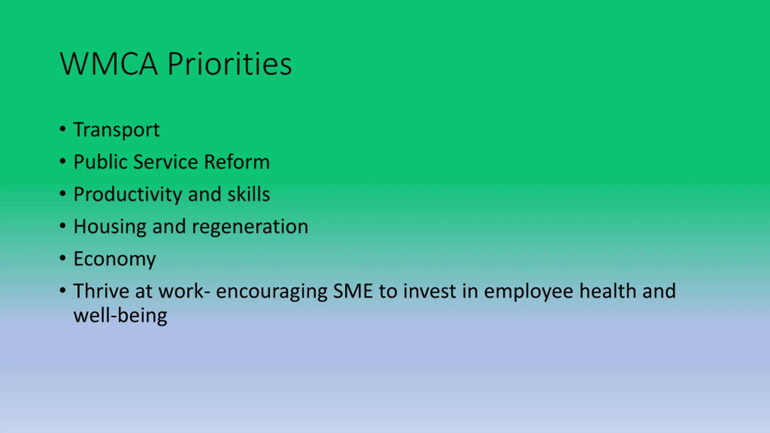 WMCA Priorities Transport Public Service Reform Productivity and skills Housing and regeneration Economy Thrive at work- encouraging SME to invest in employee health and well-being