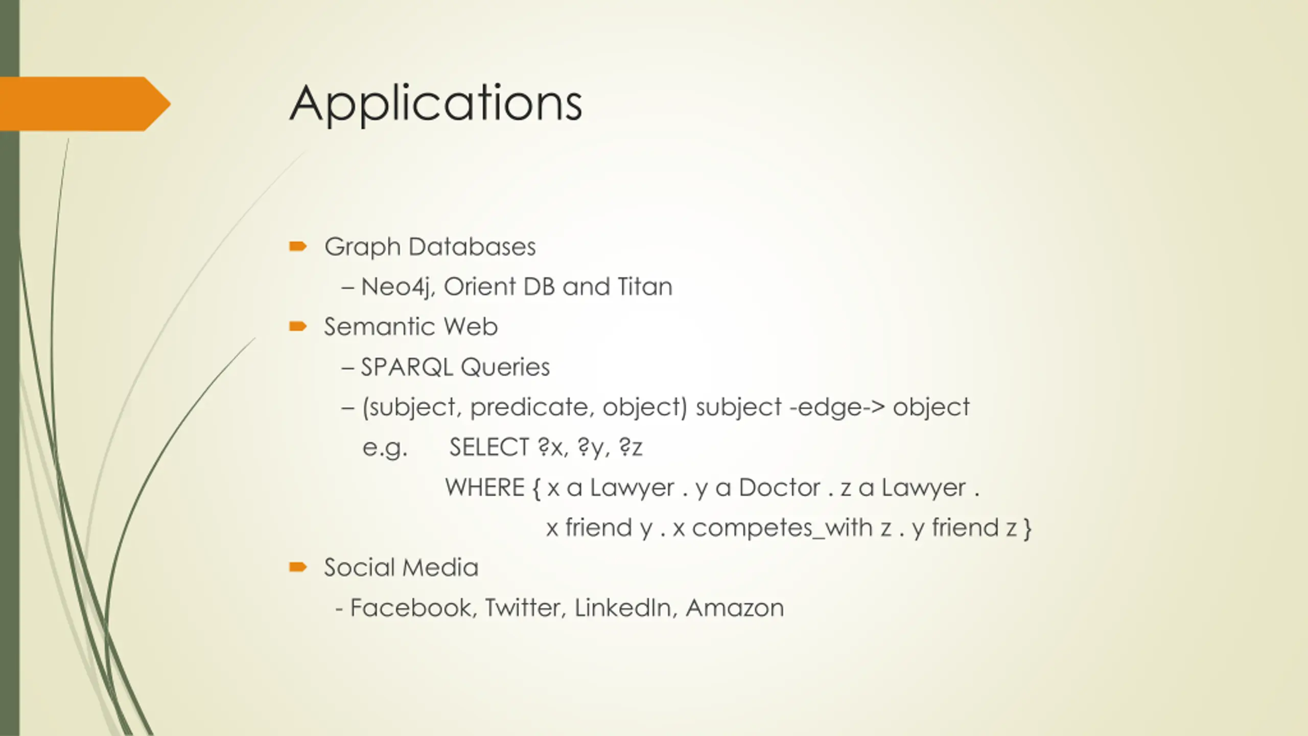 Applications Graph Databases Neo4j, Orient DB and Titan Semantic Web SPARQL Queries (subject, predicate, object) subject -edge-> object e.g. SELECT ?x, ?y, ?z WHERE { x a Lawyer . y a Doctor . z a Lawyer . x friend y . x competes_with z . y friend z } Social Media - Facebook, Twitter, LinkedIn, Amazon