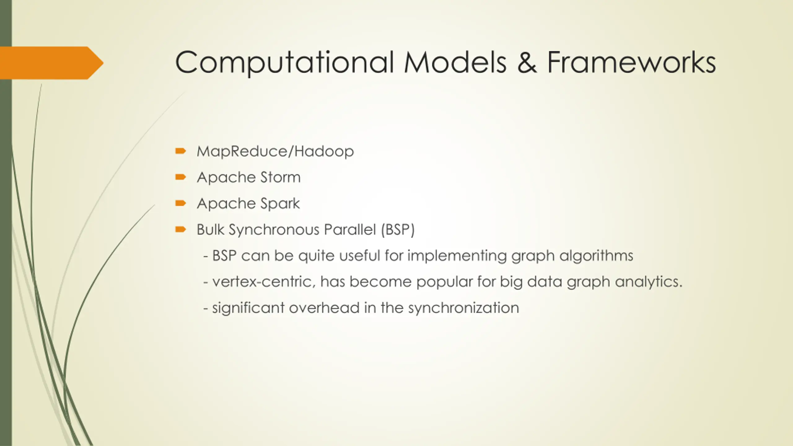 Computational Models & Frameworks MapReduce/Hadoop Apache Storm Apache Spark Bulk Synchronous Parallel (BSP) - BSP can be quite useful for implementing graph algorithms - vertex-centric, has become popular for big data graph analytics. - significant overhead in the synchronization