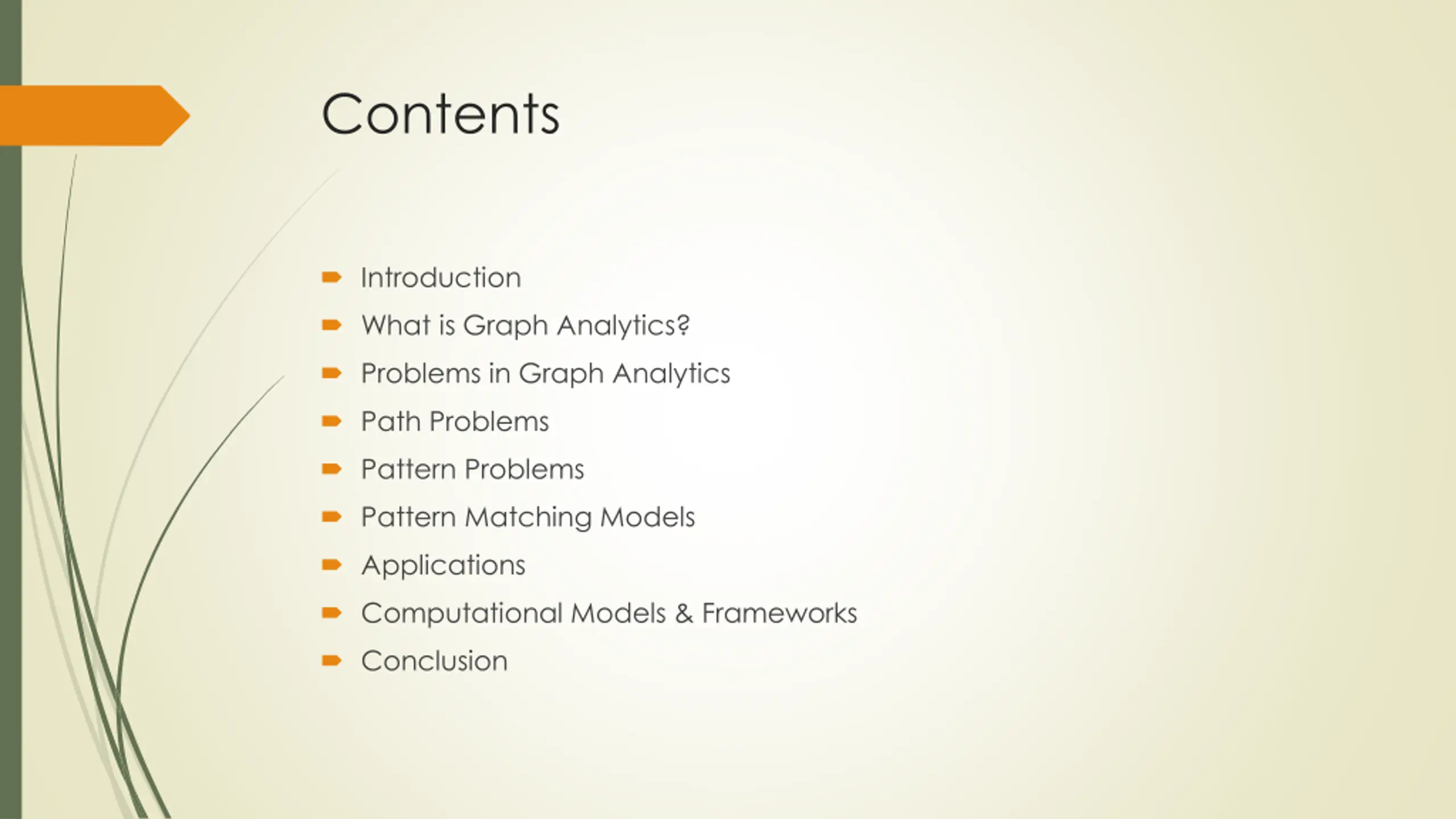 Contents Introduction What is Graph Analytics? Problems in Graph Analytics Path Problems Pattern Problems Pattern Matching Models Applications Computational Models & Frameworks Conclusion