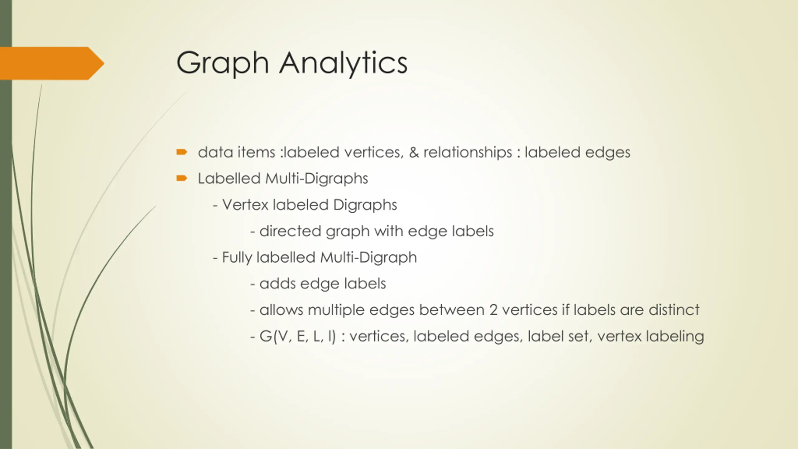 Graph Analytics data items :labeled vertices, & relationships : labeled edges Labelled Multi-Digraphs - Vertex labeled Digraphs - directed graph with edge labels - Fully labelled Multi-Digraph - adds edge labels - allows multiple edges between 2 vertices if labels are distinct - G(V, E, L, l) : vertices, labeled edges, label set, vertex labeling