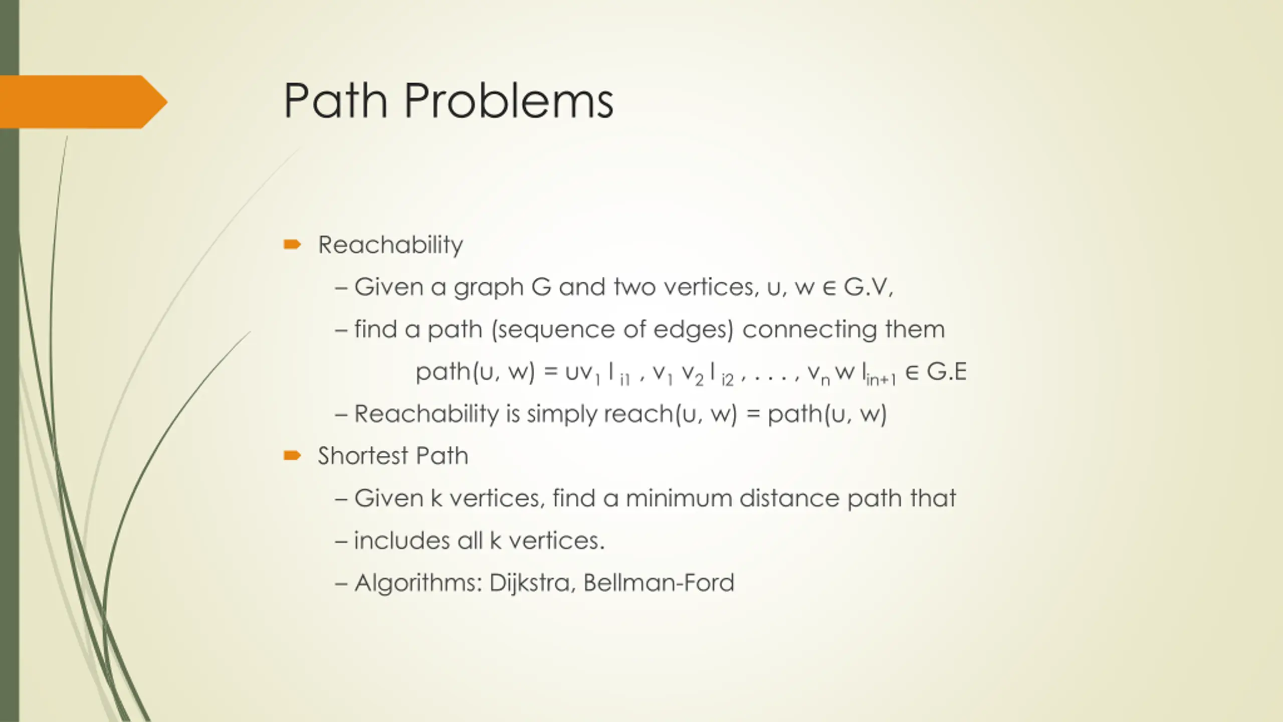 Path Problems Reachability Given a graph G and two vertices, u, w G.V, find a path (sequence of edges) connecting them path(u, w) = uv1l i1, v1v2l i2, . . . , vnw lin+1 G.E Reachability is simply reach(u, w) = path(u, w) Shortest Path Given k vertices, find a minimum distance path that includes all k vertices. Algorithms: Dijkstra, Bellman-Ford