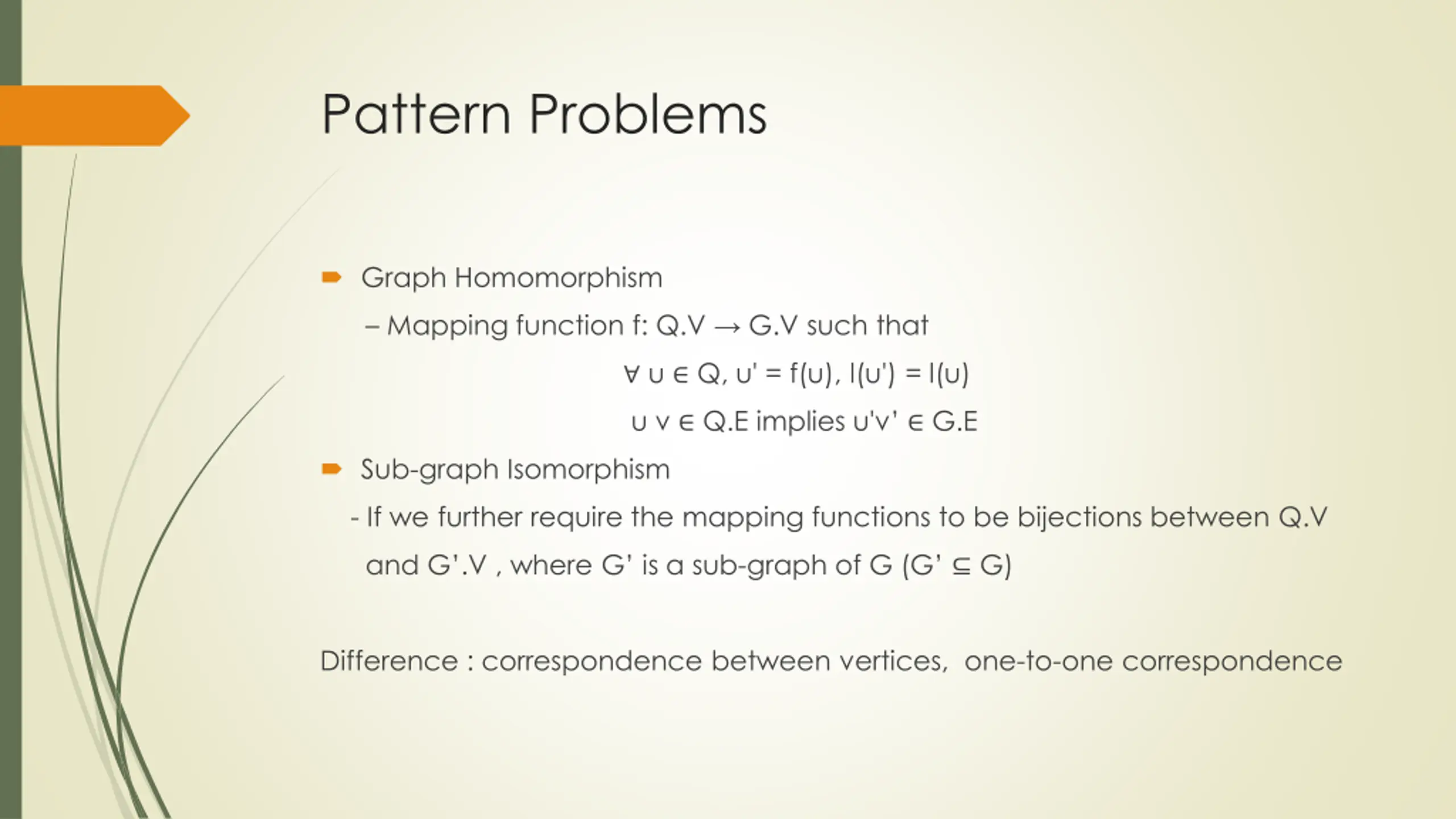 Pattern Problems Graph Homomorphism Mapping function f: Q.V G.V such that u Q, u' = f(u), l(u') = l(u) u v Q.E implies u'v G.E Sub-graph Isomorphism - If we further require the mapping functions to be bijections between Q.V and G .V , where G is a sub-graph of G (G G) Difference : correspondence between vertices, one-to-one correspondence