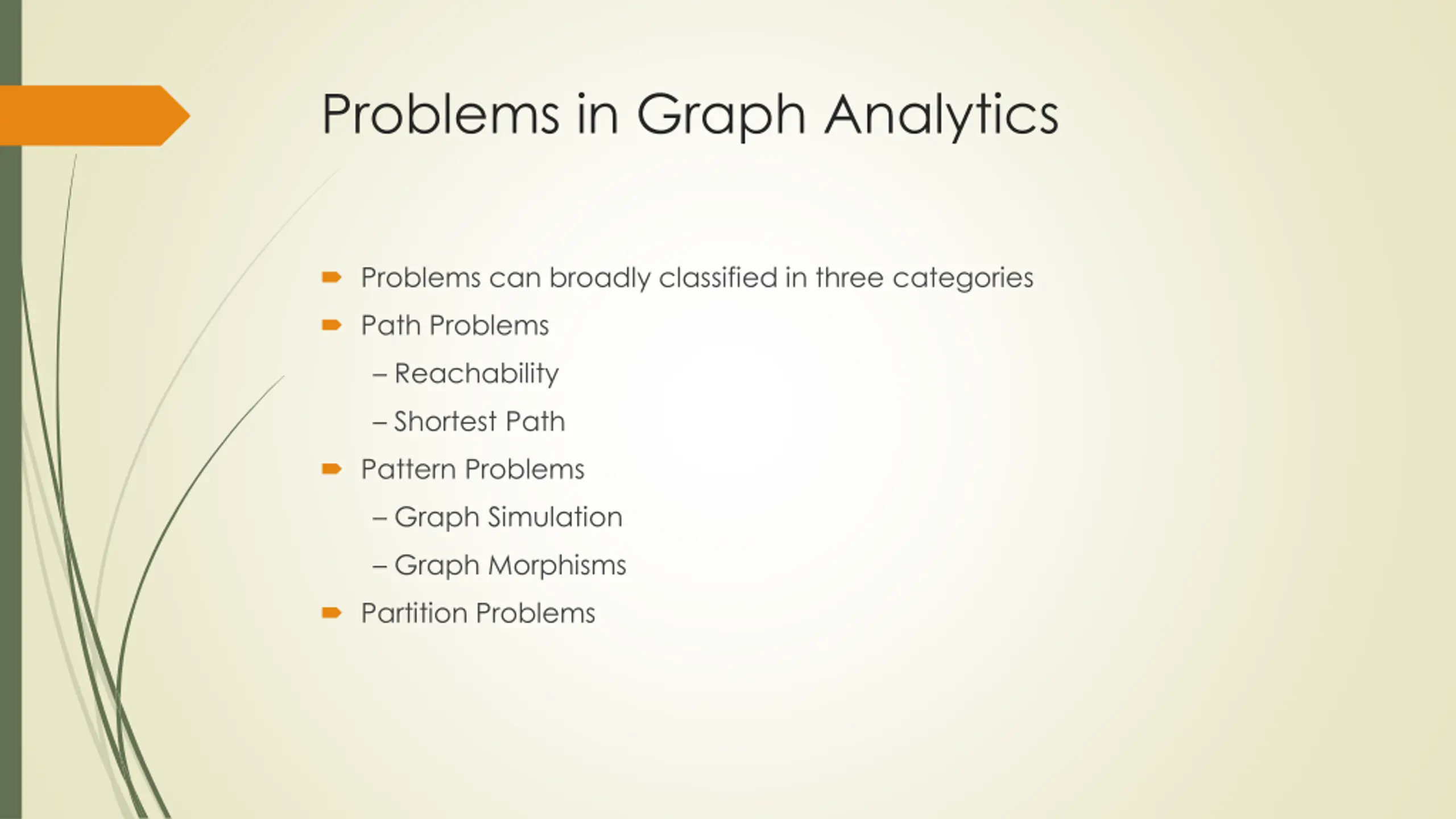 Problems in Graph Analytics Problems can broadly classified in three categories Path Problems Reachability Shortest Path Pattern Problems Graph Simulation Graph Morphisms Partition Problems