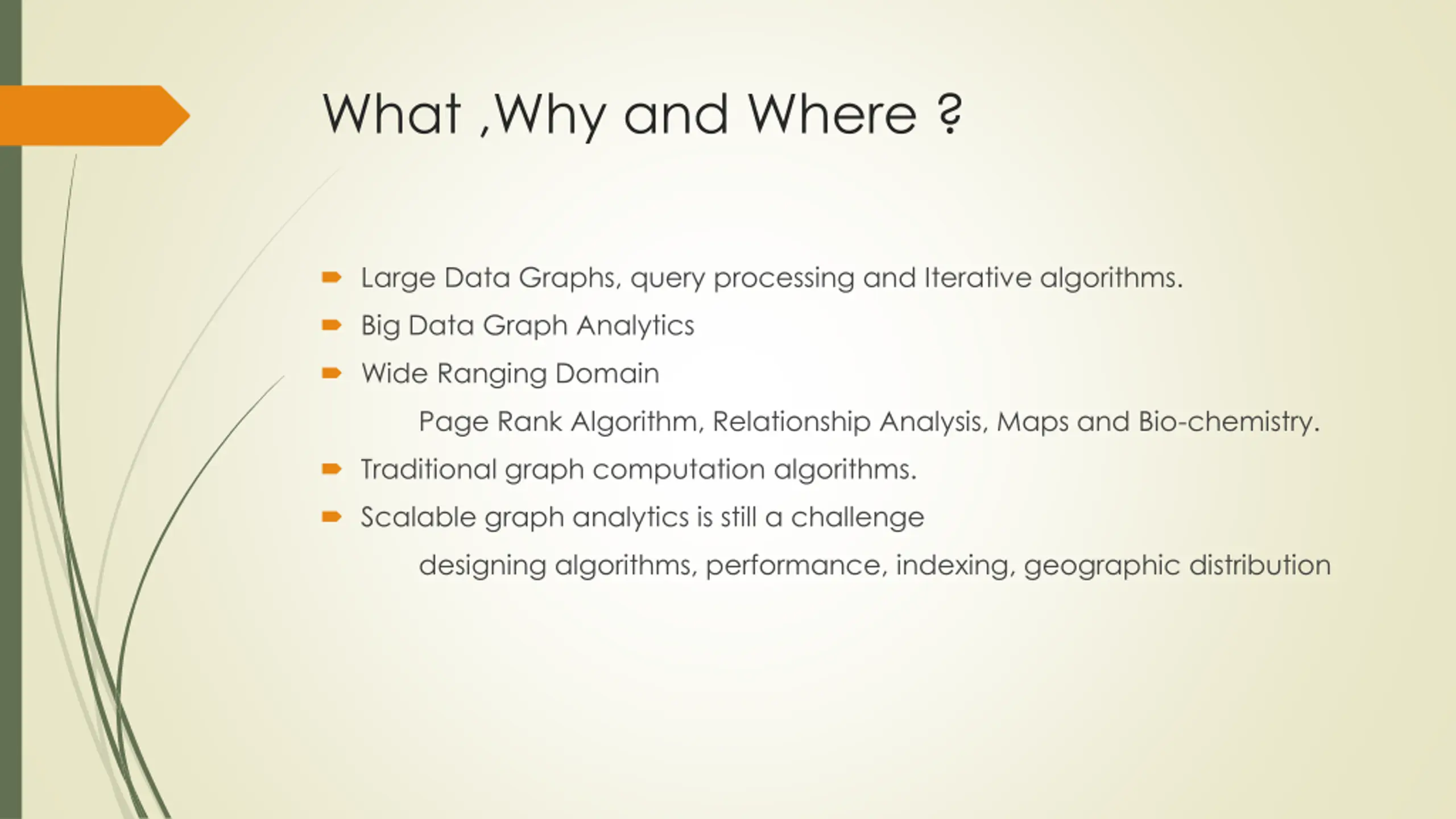 What ,Why and Where ? Large Data Graphs, query processing and Iterative algorithms. Big Data Graph Analytics Wide Ranging Domain Page Rank Algorithm, Relationship Analysis, Maps and Bio-chemistry. Traditional graph computation algorithms. Scalable graph analytics is still a challenge designing algorithms, performance, indexing, geographic distribution