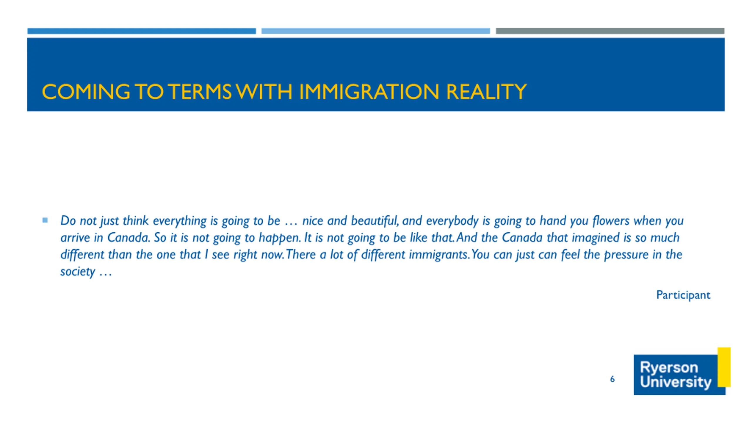 COMING TO TERMS WITH IMMIGRATION REALITY Do not just think everything is going to be nice and beautiful, and everybody is going to hand you flowers when you arrive in Canada. So it is not going to happen. It is not going to be like that. And the Canada that imagined is so much different than the one that I see right now. There a lot of different immigrants. You can just can feel the pressure in the society Participant 6