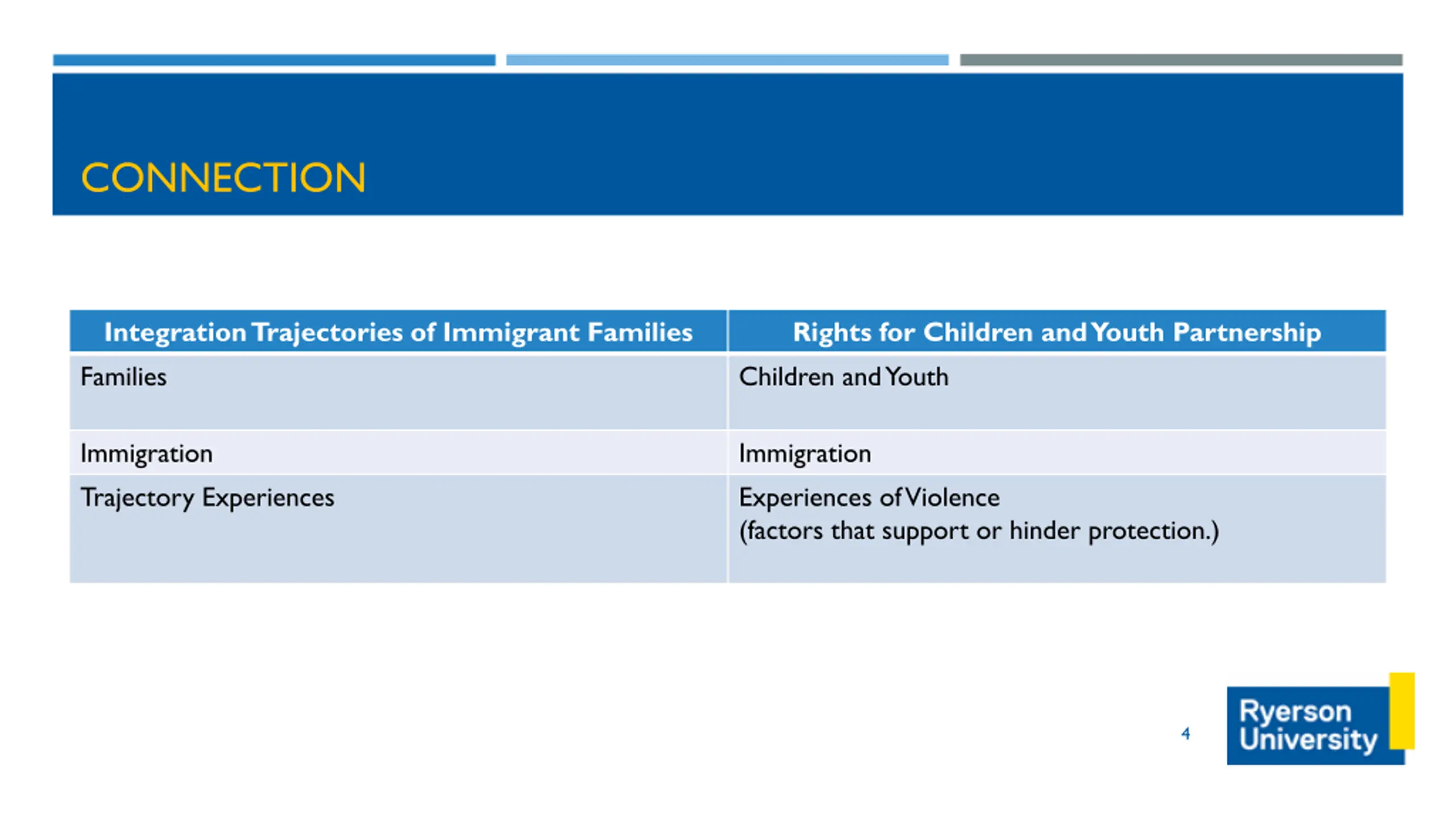 CONNECTION Integration Trajectories of Immigrant Families Families Rights for Children and Youth Partnership Children and Youth Immigration Trajectory Experiences Immigration Experiences of Violence (factors that support or hinder protection.) 4