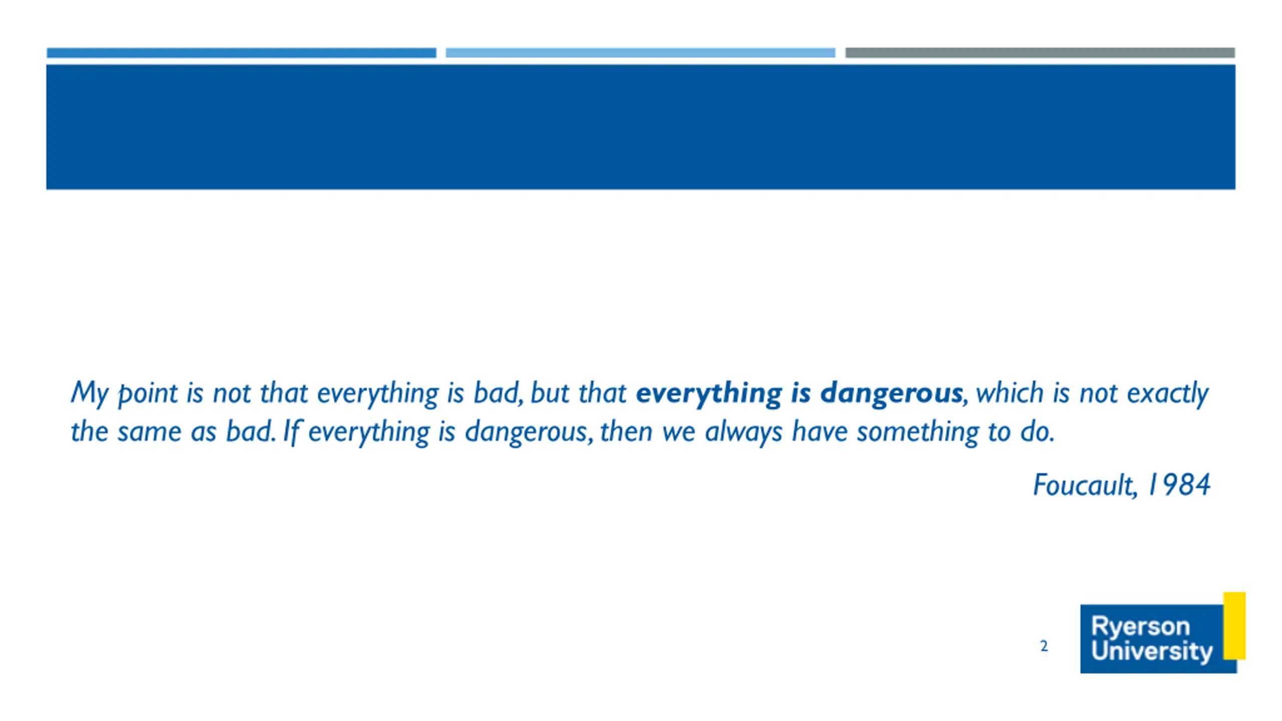My point is not that everything is bad, but that everything is dangerous, which is not exactly the same as bad. If everything is dangerous, then we always have something to do. Foucault, 1984 2
