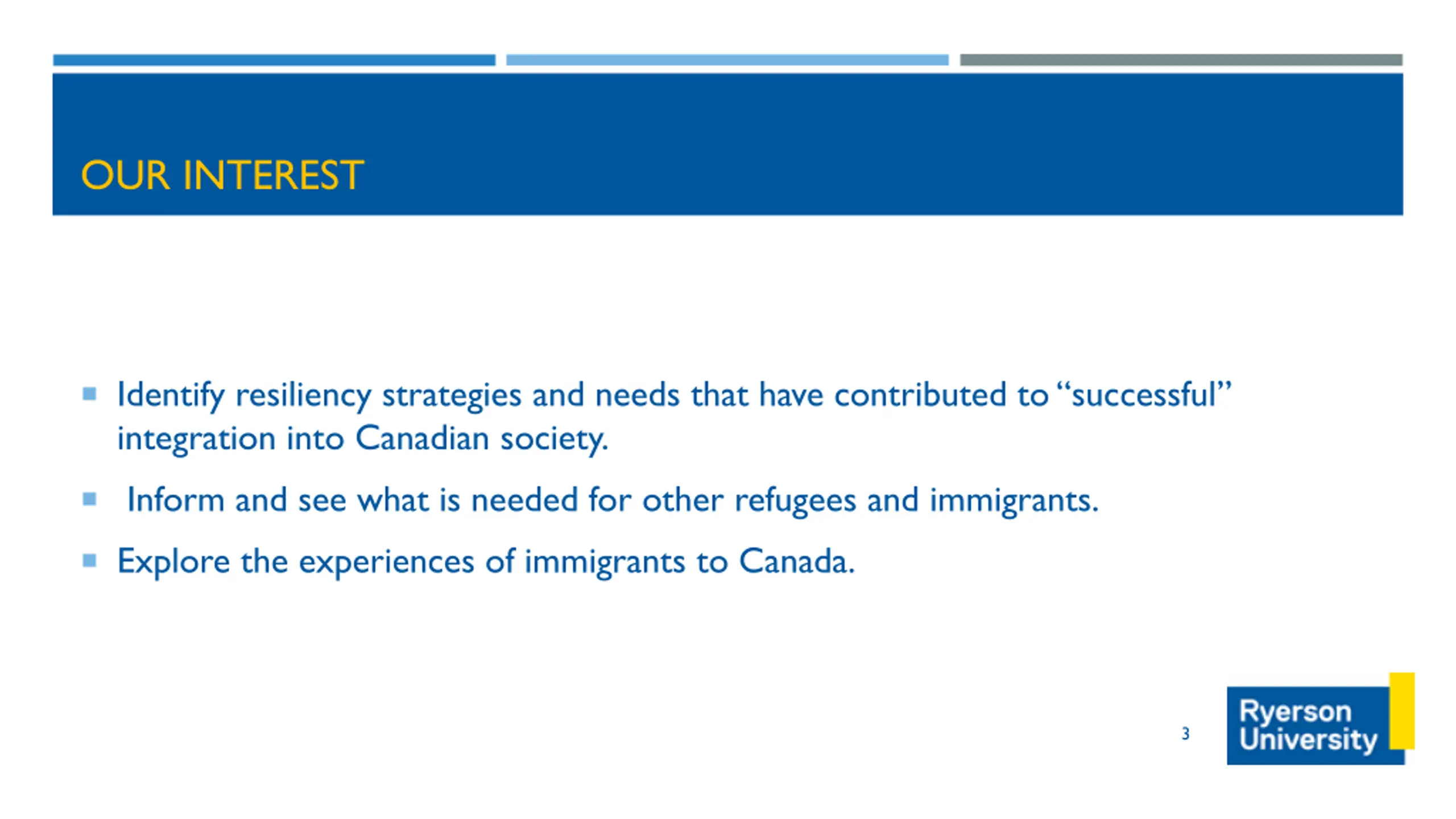 OUR INTEREST Identify resiliency strategies and needs that have contributed to successful integration into Canadian society. Inform and see what is needed for other refugees and immigrants. Explore the experiences of immigrants to Canada. 3