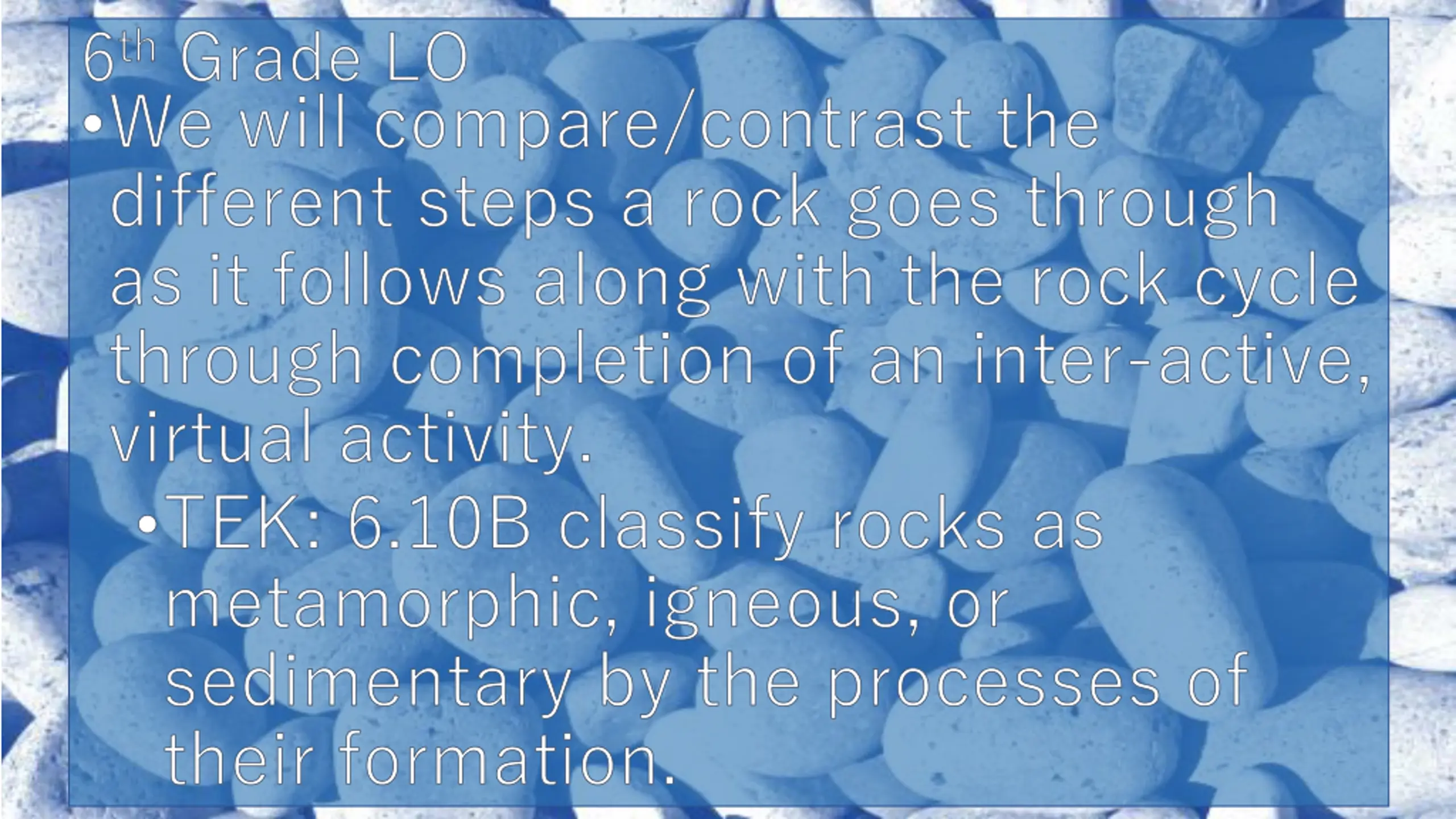 6thGrade LO We will compare/contrast the different steps a rock goes through as it follows along with the rock cycle through completion of an inter-active, virtual activity. TEK: 6.10B classify rocks as metamorphic, igneous, or sedimentary by the processes of their formation.