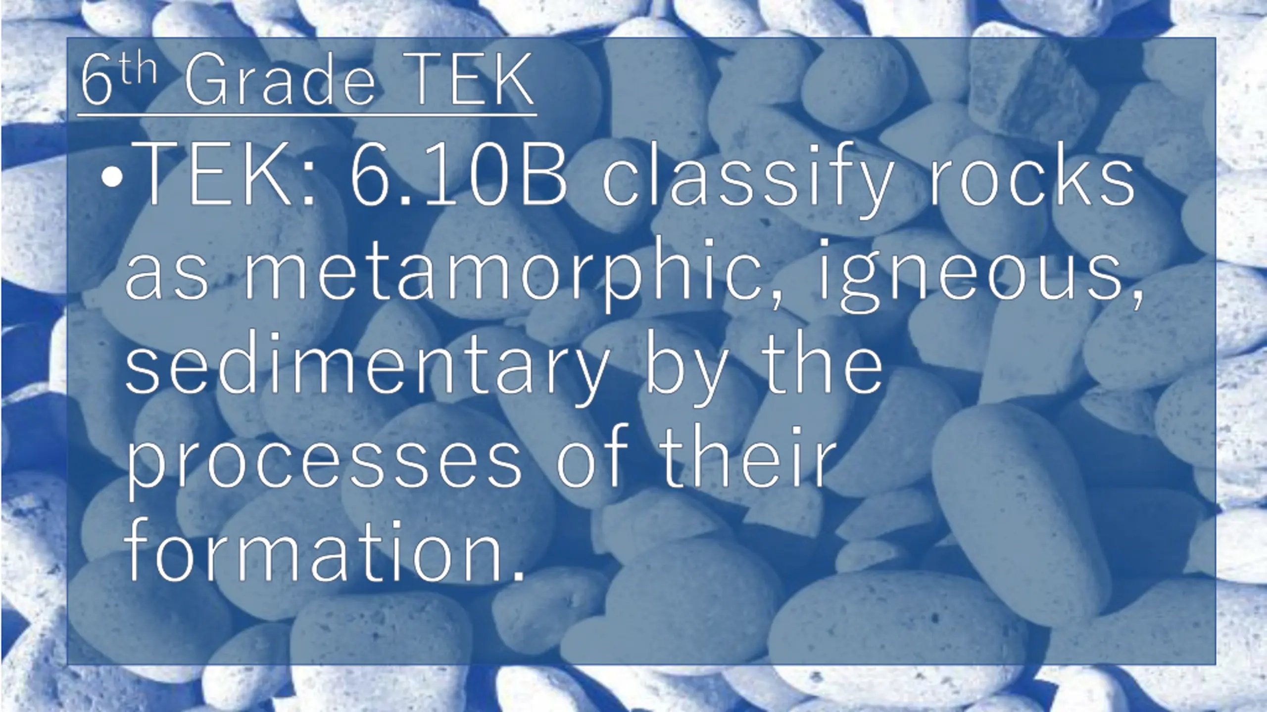6thGrade TEK TEK: 6.10B classify rocks as metamorphic, igneous, sedimentary by the processes of their formation.