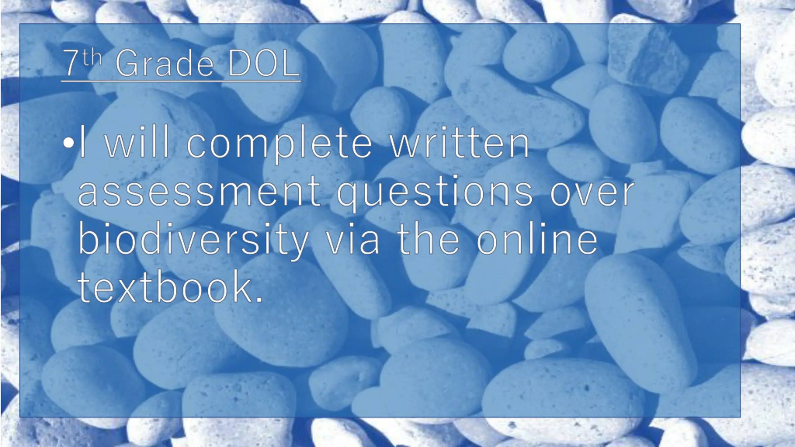 7thGrade DOL I will complete written assessment questions over biodiversity via the online textbook.