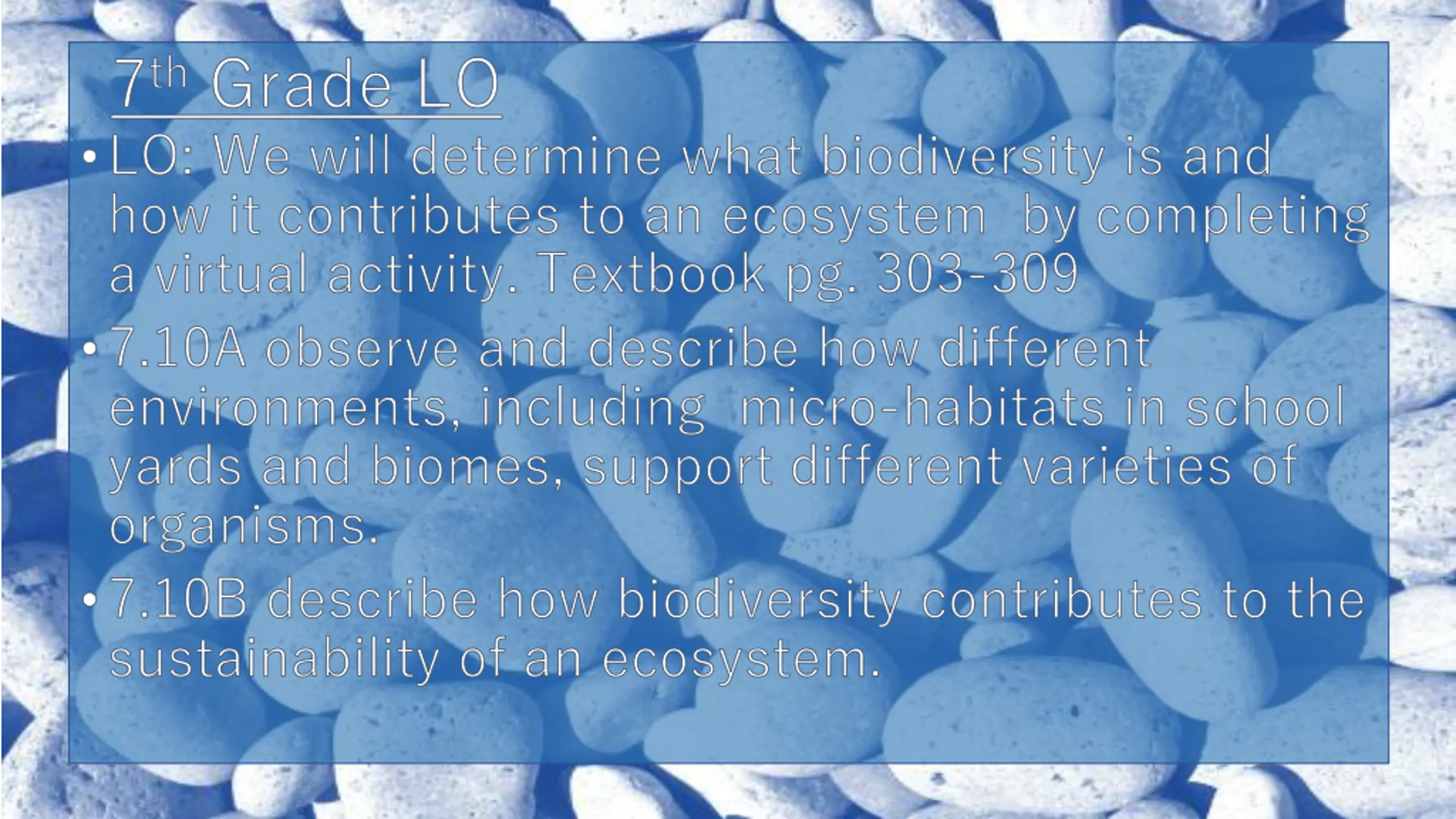 7thGrade LO LO: We will determine what biodiversity is and how it contributes to an ecosystem by completing a virtual activity. Textbook pg. 303-309 7.10A observe and describe how different environments, including micro-habitats in school yards and biomes, support different varieties of organisms. 7.10B describe how biodiversity contributes to the sustainability of an ecosystem.