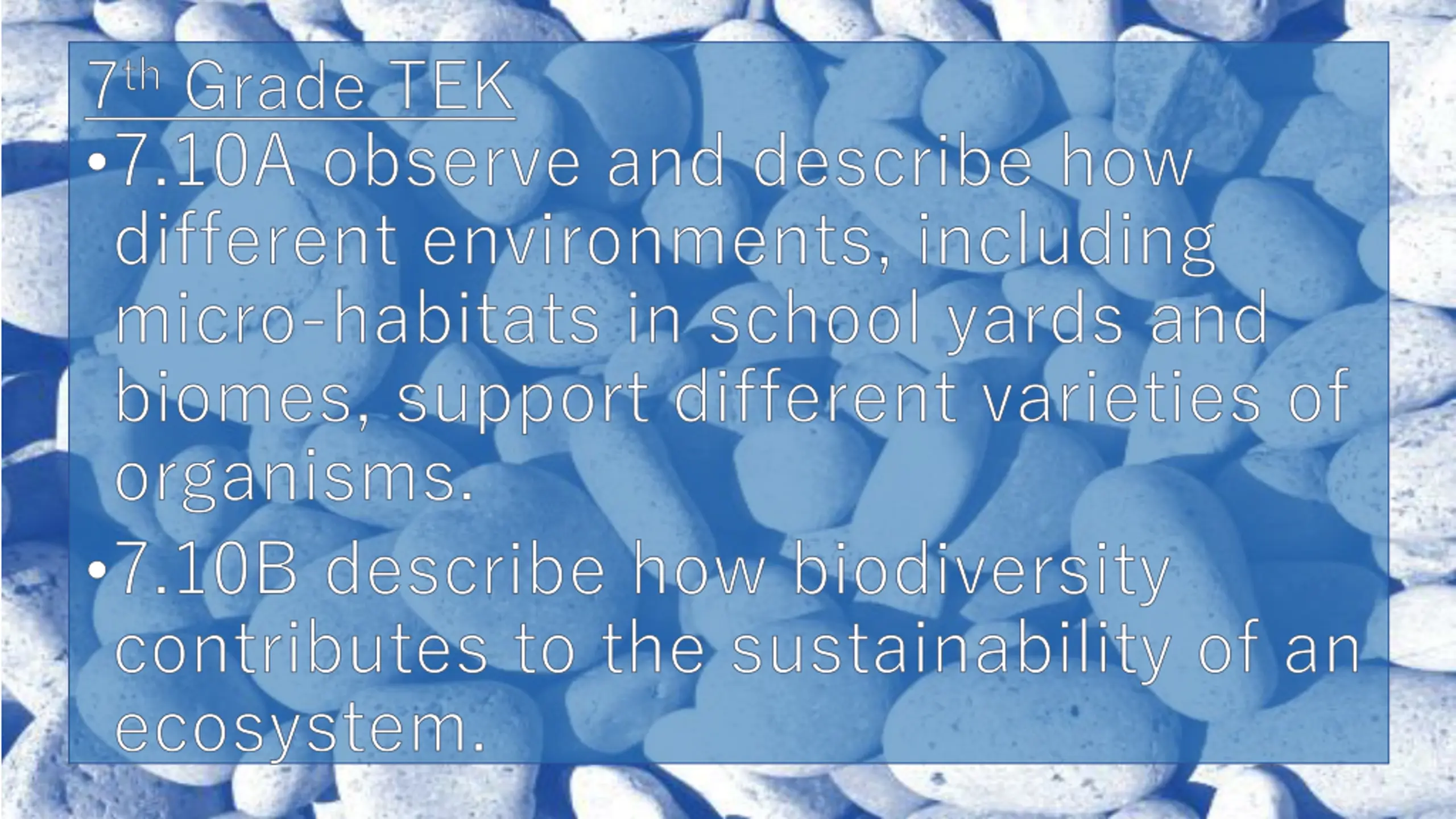 7thGrade TEK 7.10A observe and describe how different environments, including micro-habitats in school yards and biomes, support different varieties of organisms. 7.10B describe how biodiversity contributes to the sustainability of an ecosystem.