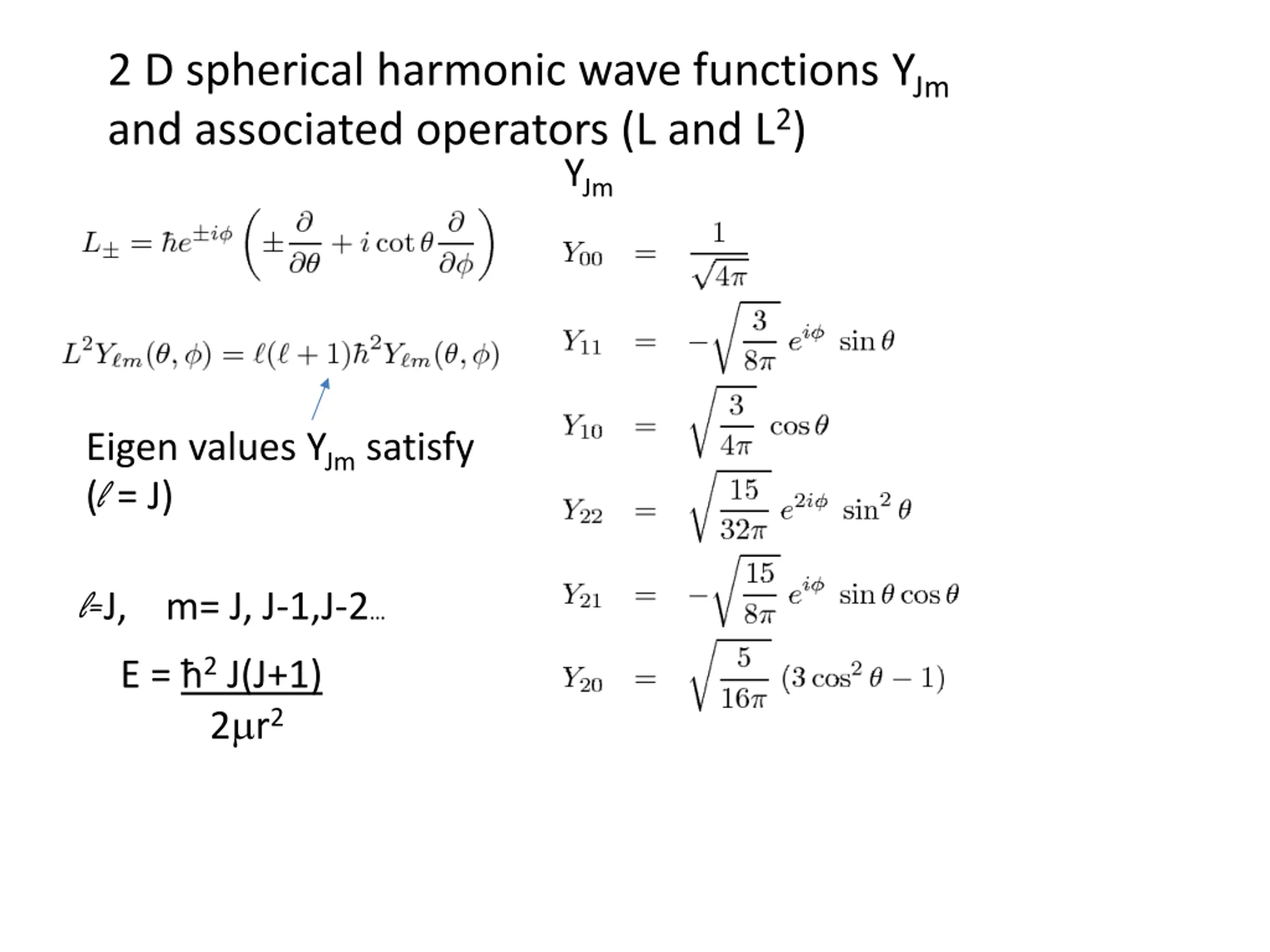 2 D spherical harmonic wave functions YJm and associated operators (L and L2) YJm Eigen values YJm satisfy (l = J) l=J, m= J, J-1,J-2 E = 2 J(J+1) 2 r2
