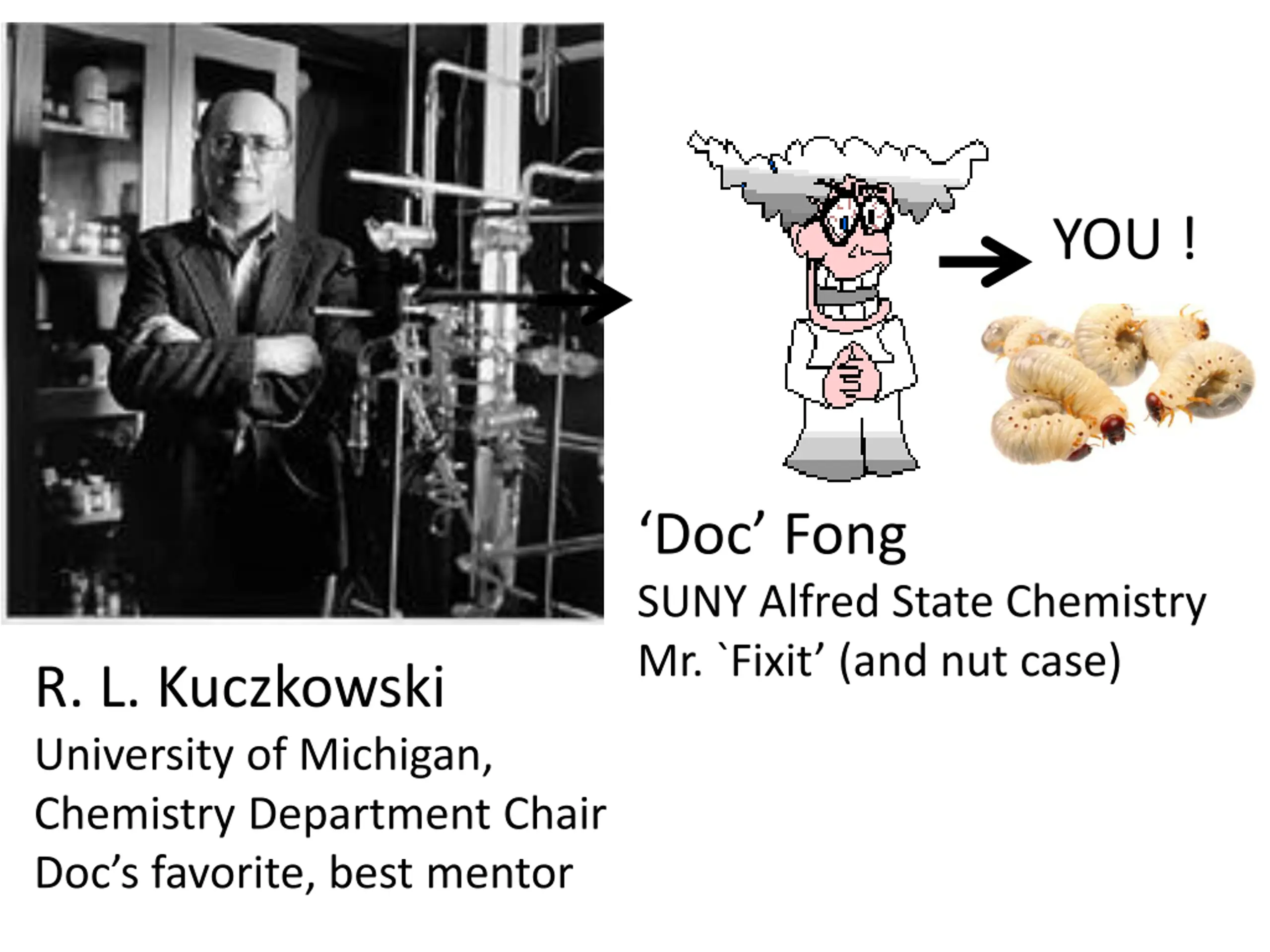 http://academictree.org/photo/cache.068119.jpg YOU ! Doc Fong SUNY Alfred State Chemistry Mr. `Fixit (and nut case) R. L. Kuczkowski University of Michigan, Chemistry Department Chair Doc s favorite, best mentor