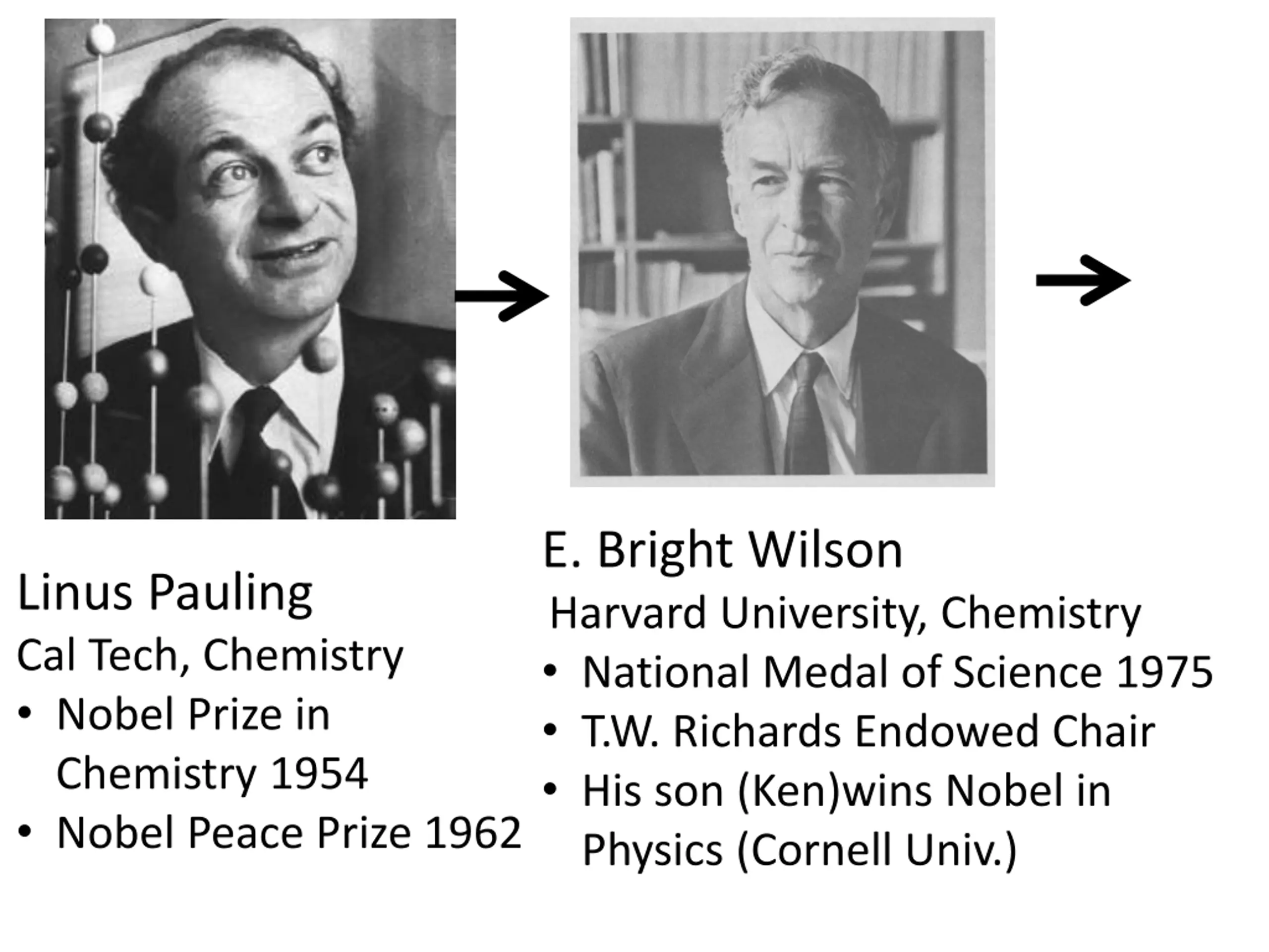 http://pages.pomona.edu/~wes04747/chem164/MolZoo/EBW.jpg E. Bright Wilson Harvard University, Chemistry National Medal of Science 1975 T.W. Richards Endowed Chair His son (Ken)wins Nobel in Physics (Cornell Univ.) Linus Pauling Cal Tech, Chemistry Nobel Prize in Chemistry 1954 Nobel Peace Prize 1962