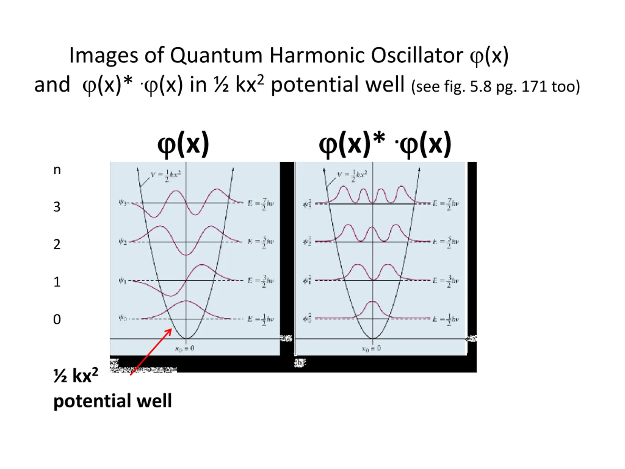 Images of Quantum Harmonic Oscillator (x) and (x)* . (x) in kx2 potential well (see fig. 5.8 pg. 171 too) (x) (x)* . (x) n 3 2 1 0 kx2 potential well