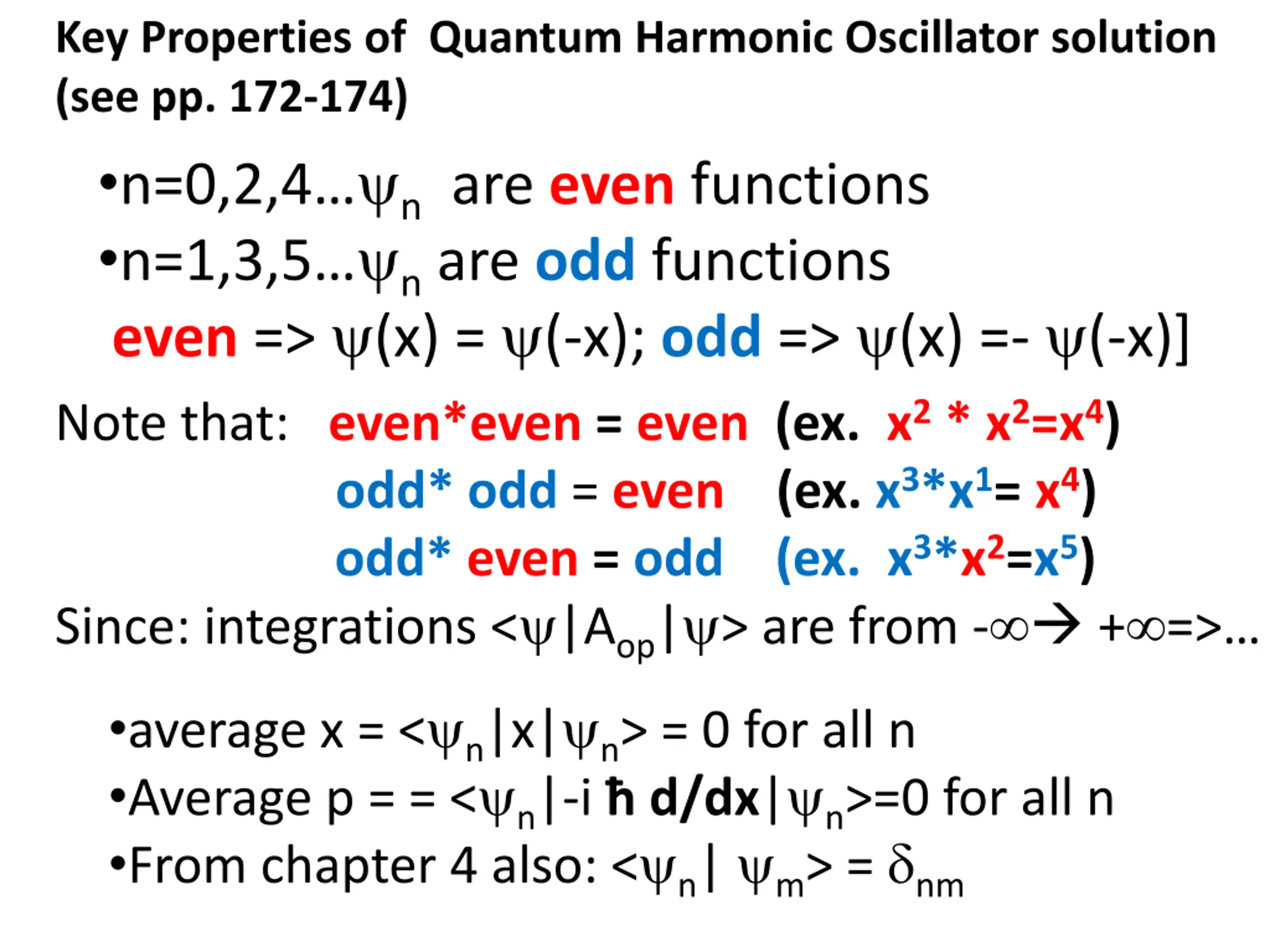 Key Properties of Quantum Harmonic Oscillator solution (see pp. 172-174) n=0,2,4 n are even functions n=1,3,5 n are odd functions even => (x) = (-x); odd => (x) =- (-x)] Note that: even*even = even (ex. x2 * x2=x4) odd* odd = even (ex. x3*x1= x4) odd* even = odd (ex. x3*x2=x5) Since: integrations < |Aop| > are from - + => average x = < n|x| n> = 0 for all n Average p = = < n|-i d/dx| n>=0 for all n From chapter 4 also: < n| m> = nm