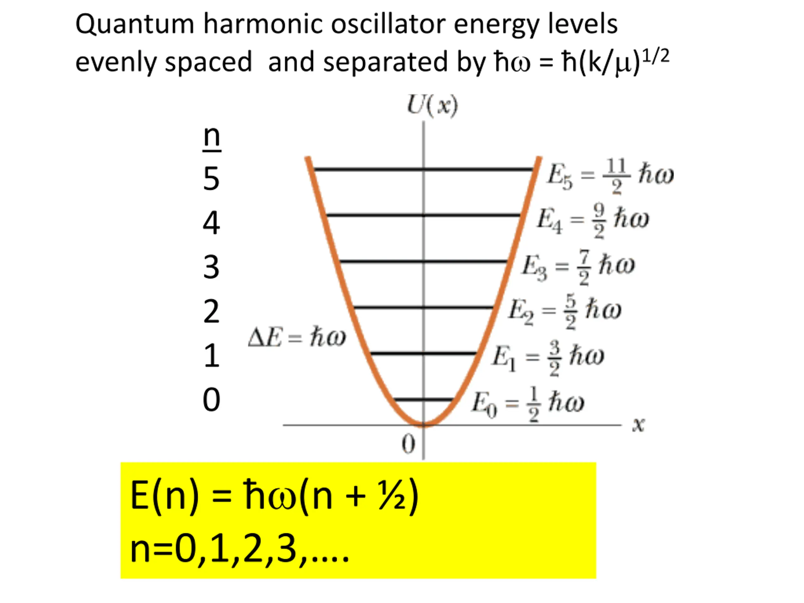 Quantum harmonic oscillator energy levels evenly spaced and separated by = (k/ )1/2 http://www4.uwsp.edu/physastr/kmenning/images/pse6.41.f.14.gif n 5 4 3 2 1 0 E(n) = (n + ) n=0,1,2,3, .