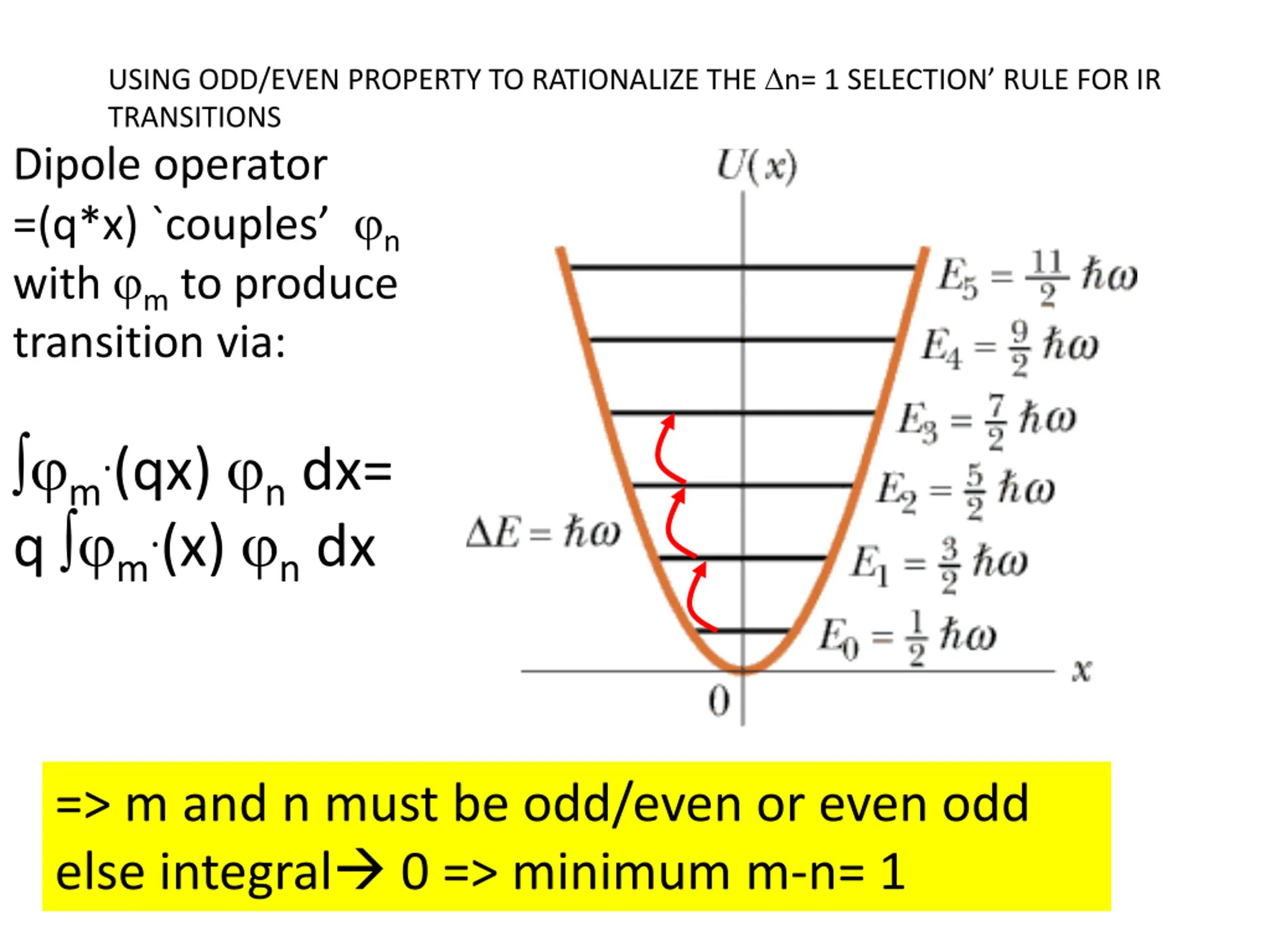 USING ODD/EVEN PROPERTY TO RATIONALIZE THE n= 1 SELECTION RULE FOR IR TRANSITIONS Dipole operator =(q*x) `couples n with m to produce transition via: http://www4.uwsp.edu/physastr/kmenning/images/pse6.41.f.14.gif m.(qx) n dx= q m.(x) n dx => m and n must be odd/even or even odd else integral 0 => minimum m-n= 1