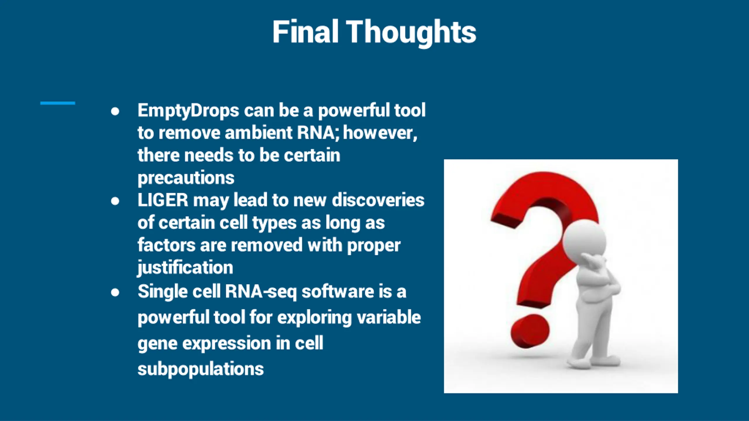 Final Thoughts EmptyDrops can be a powerful tool to remove ambient RNA; however, there needs to be certain precautions LIGER may lead to new discoveries of certain cell types as long as factors are removed with proper justification Single cell RNA-seq software is a powerful tool for exploring variable gene expression in cell subpopulations
