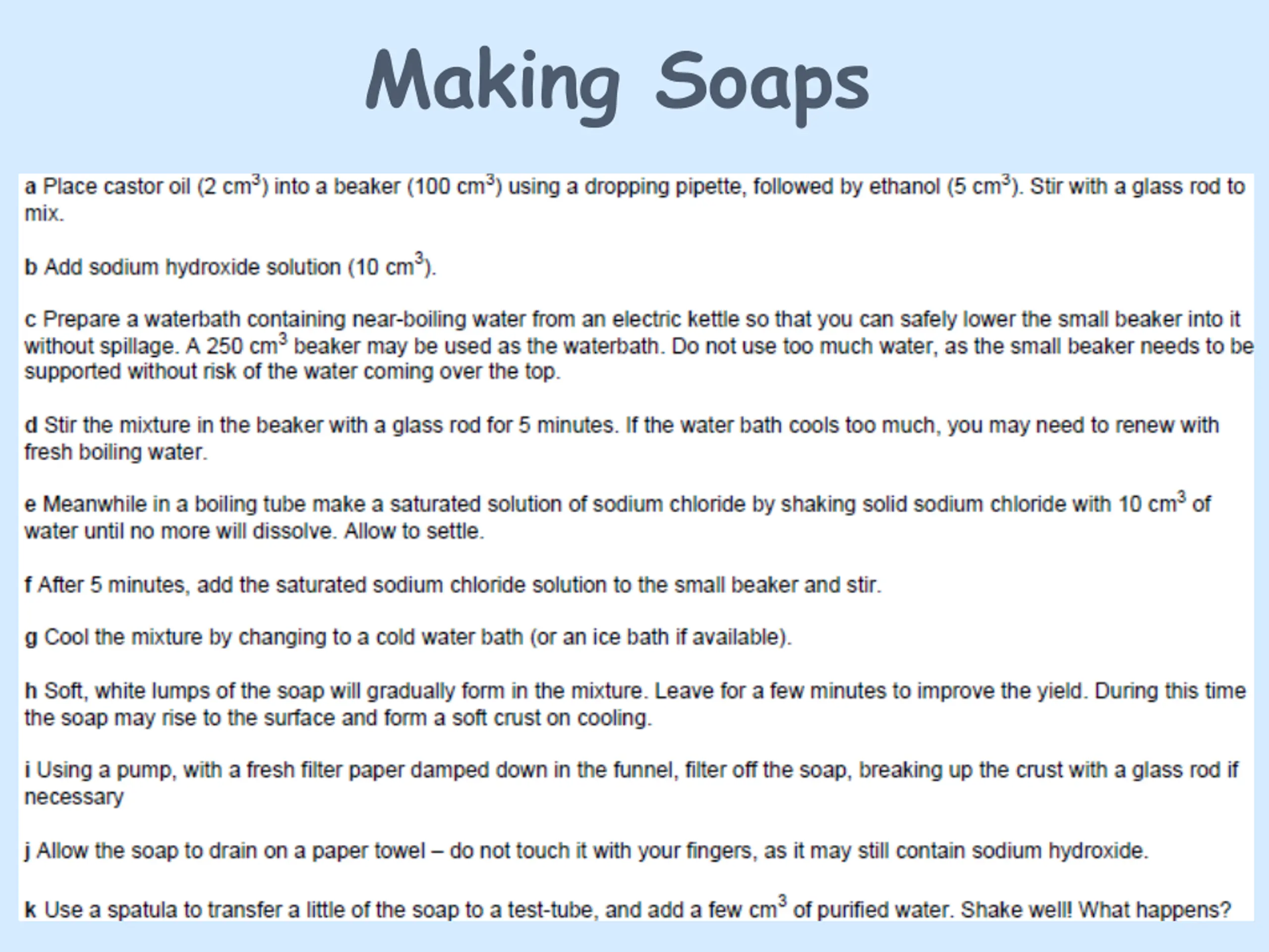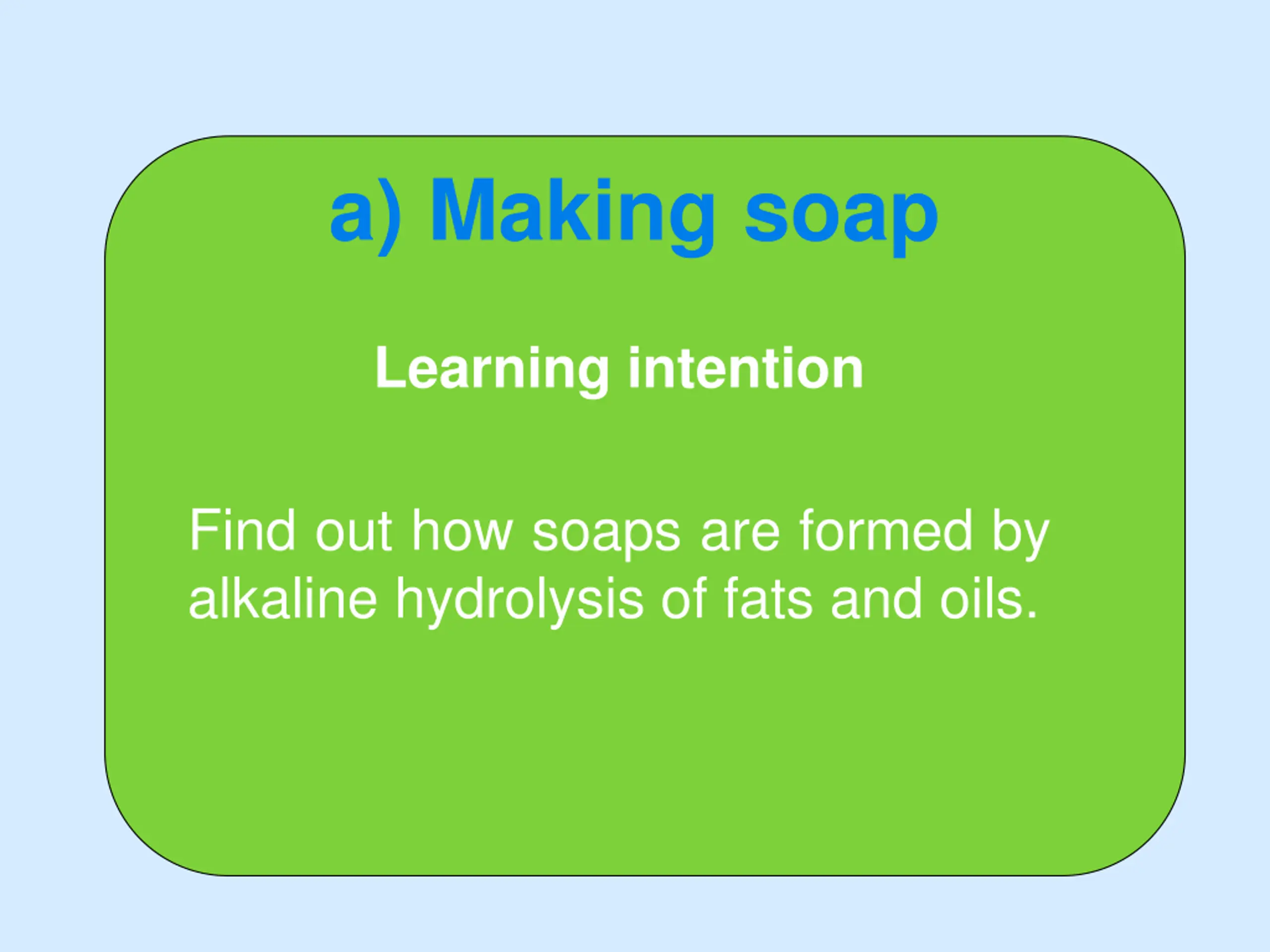 a) Making soap Learning intention Find out how soaps are formed by alkaline hydrolysis of fats and oils.