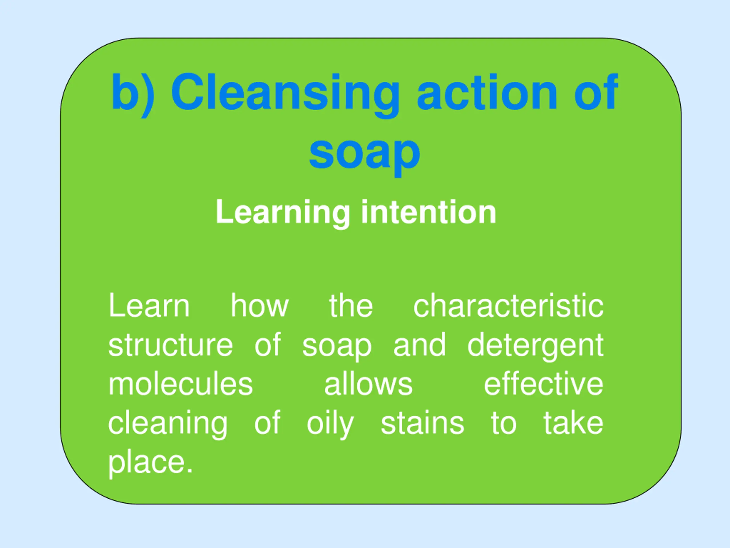 b) Cleansing action of soap Learning intention Learn structure of soap and detergent molecules allows cleaning of oily stains to take place. how the characteristic effective