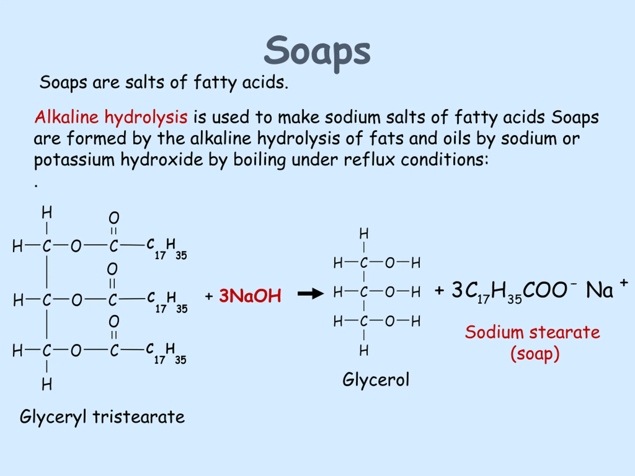 C17H35COO- - Soaps Soaps are salts of fatty acids. Alkaline hydrolysis is used to make sodium salts of fatty acids Soaps are formed by the alkaline hydrolysis of fats and oils by sodium or potassium hydroxide by boiling under reflux conditions: . H O H C 17H H C O C O 35 H C O H Na + + 3 C17H35COO- - H C O H + 3NaOH C 17H H C O C O 35 H C O H Sodium stearate (soap) C 17H H C O C H 35 Glycerol H Glyceryl tristearate