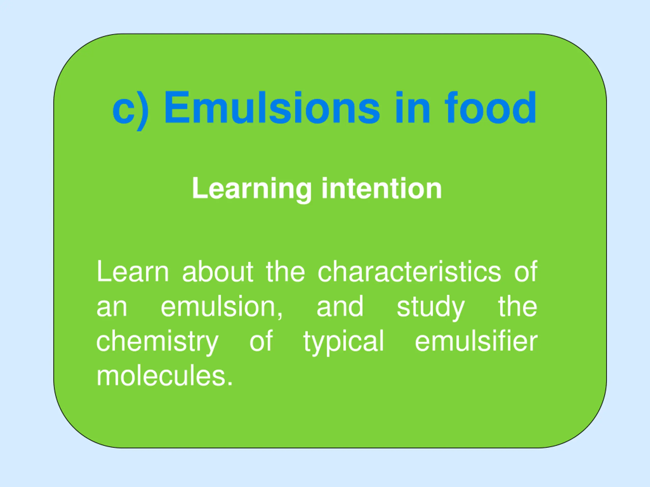c) Emulsions in food Learning intention Learn about the characteristics of an emulsion, and study the chemistry of typical emulsifier molecules.