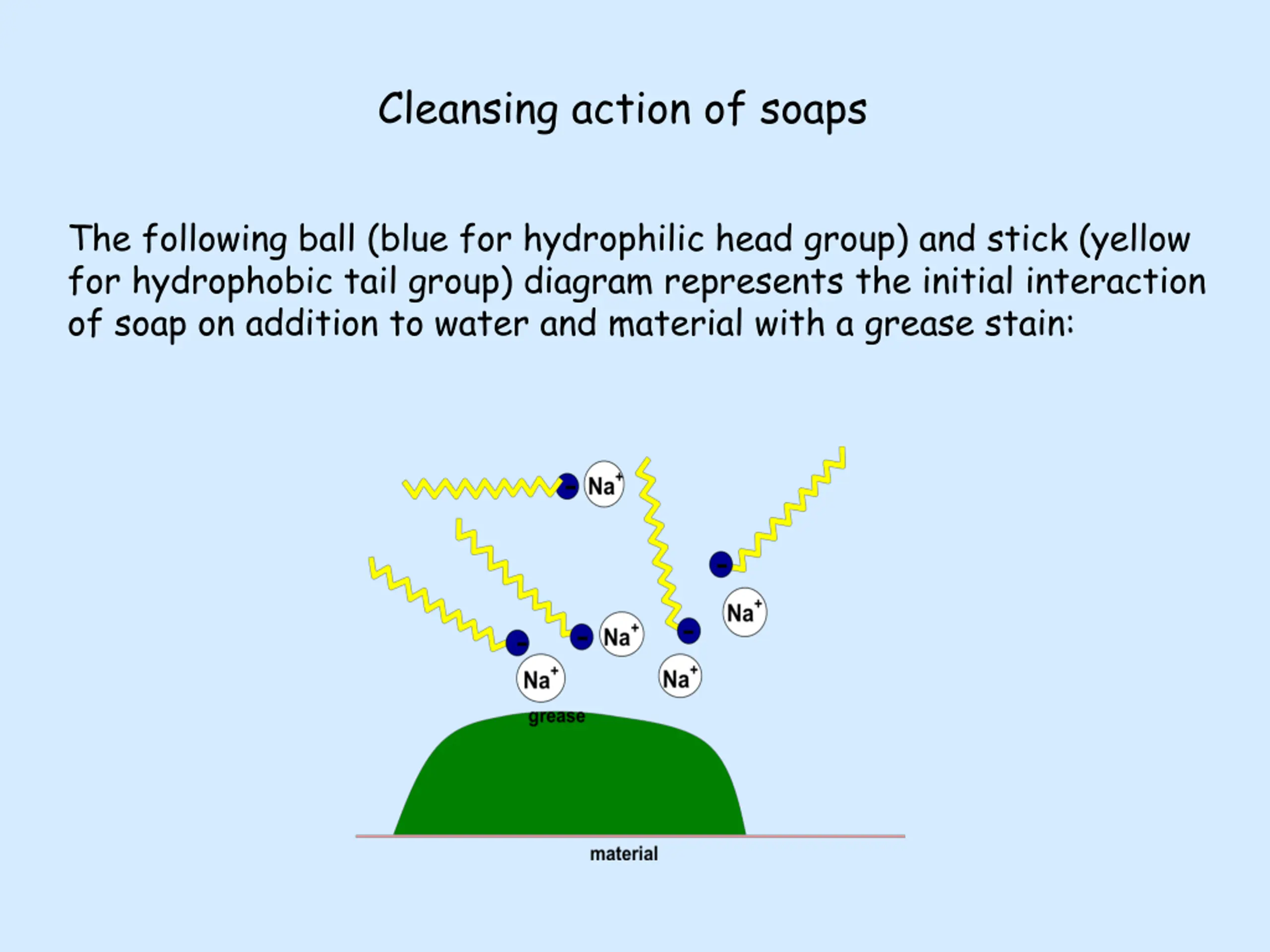 Cleansing action of soaps The following ball (blue for hydrophilic head group) and stick (yellow for hydrophobic tail group) diagram represents the initial interaction of soap on addition to water and material with a grease stain: