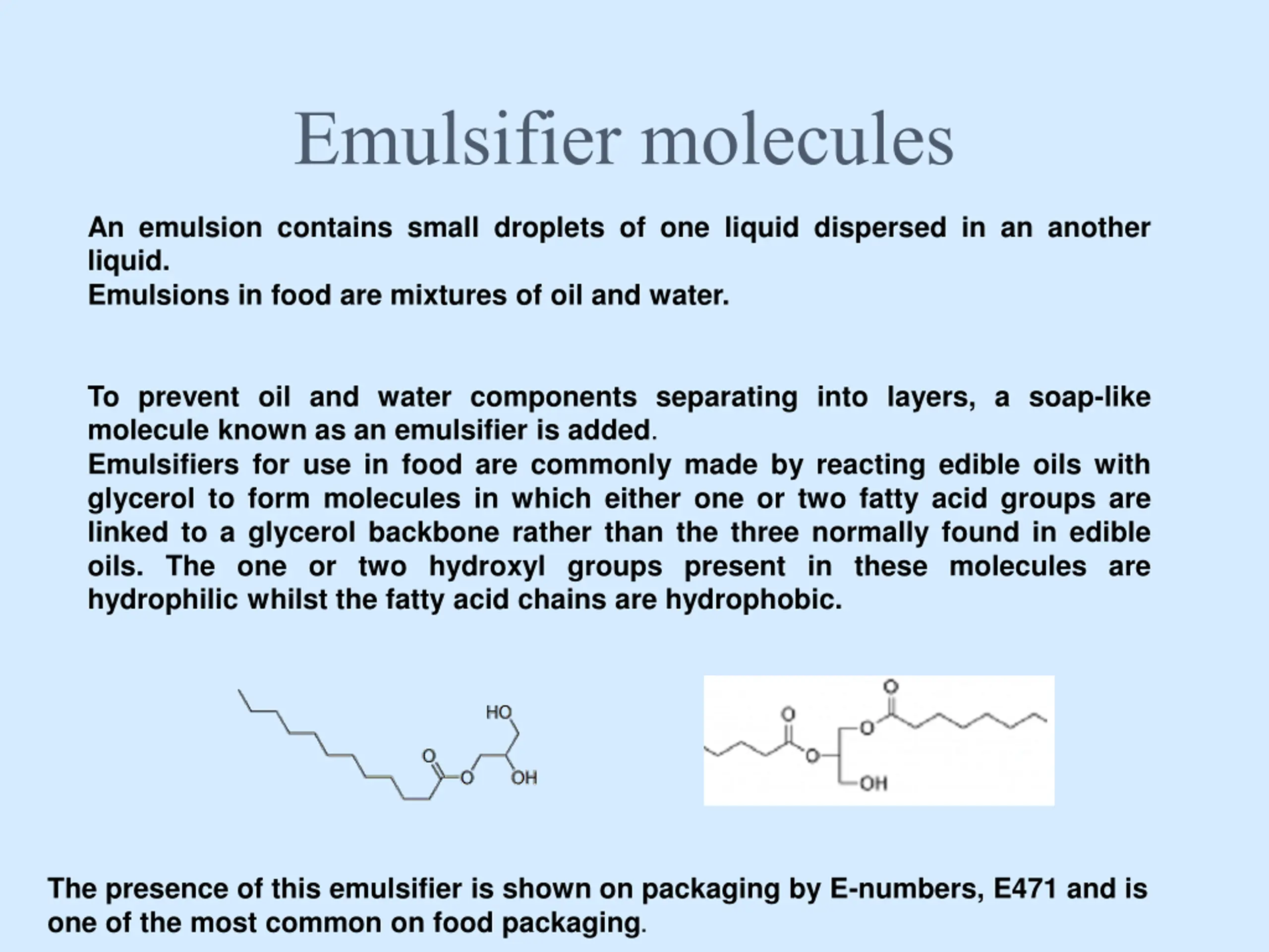 Emulsifier molecules An emulsion contains small droplets of one liquid dispersed in an another liquid. Emulsions in food are mixtures of oil and water. To prevent oil and water components separating into layers, a soap-like molecule known as an emulsifier is added. Emulsifiers for use in food are commonly made by reacting edible oils with glycerol to form molecules in which either one or two fatty acid groups are linked to a glycerol backbone rather than the three normally found in edible oils. The one or two hydroxyl groups present in these molecules are hydrophilic whilst the fatty acid chains are hydrophobic. The presence of this emulsifier is shown on packaging by E-numbers, E471 and is one of the most common on food packaging.