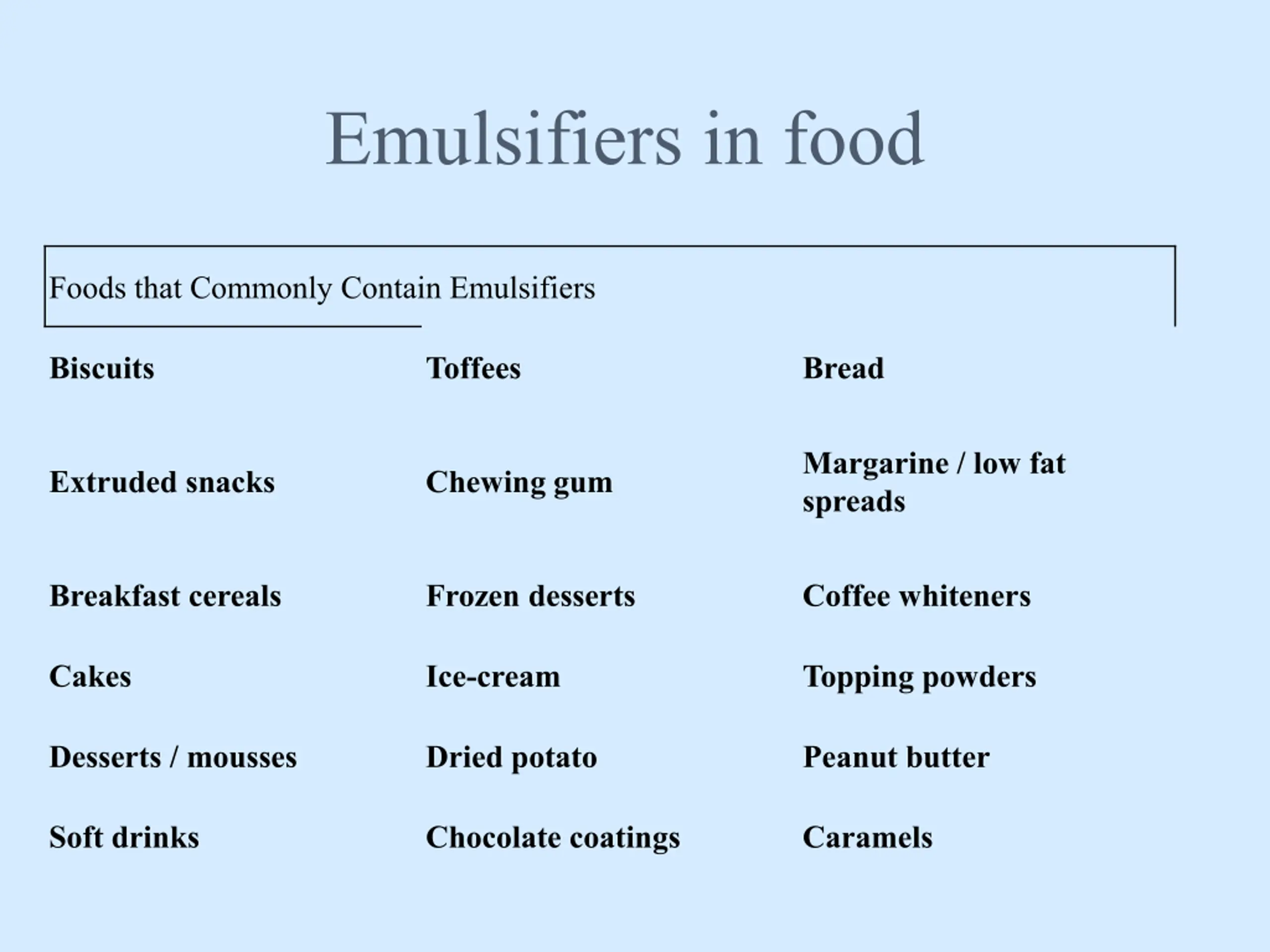 Emulsifiers in food Foods that Commonly Contain Emulsifiers Biscuits Toffees Bread Margarine / low fat spreads Extruded snacks Chewing gum Breakfast cereals Frozen desserts Coffee whiteners Cakes Ice-cream Topping powders Desserts / mousses Dried potato Peanut butter Soft drinks Chocolate coatings Caramels