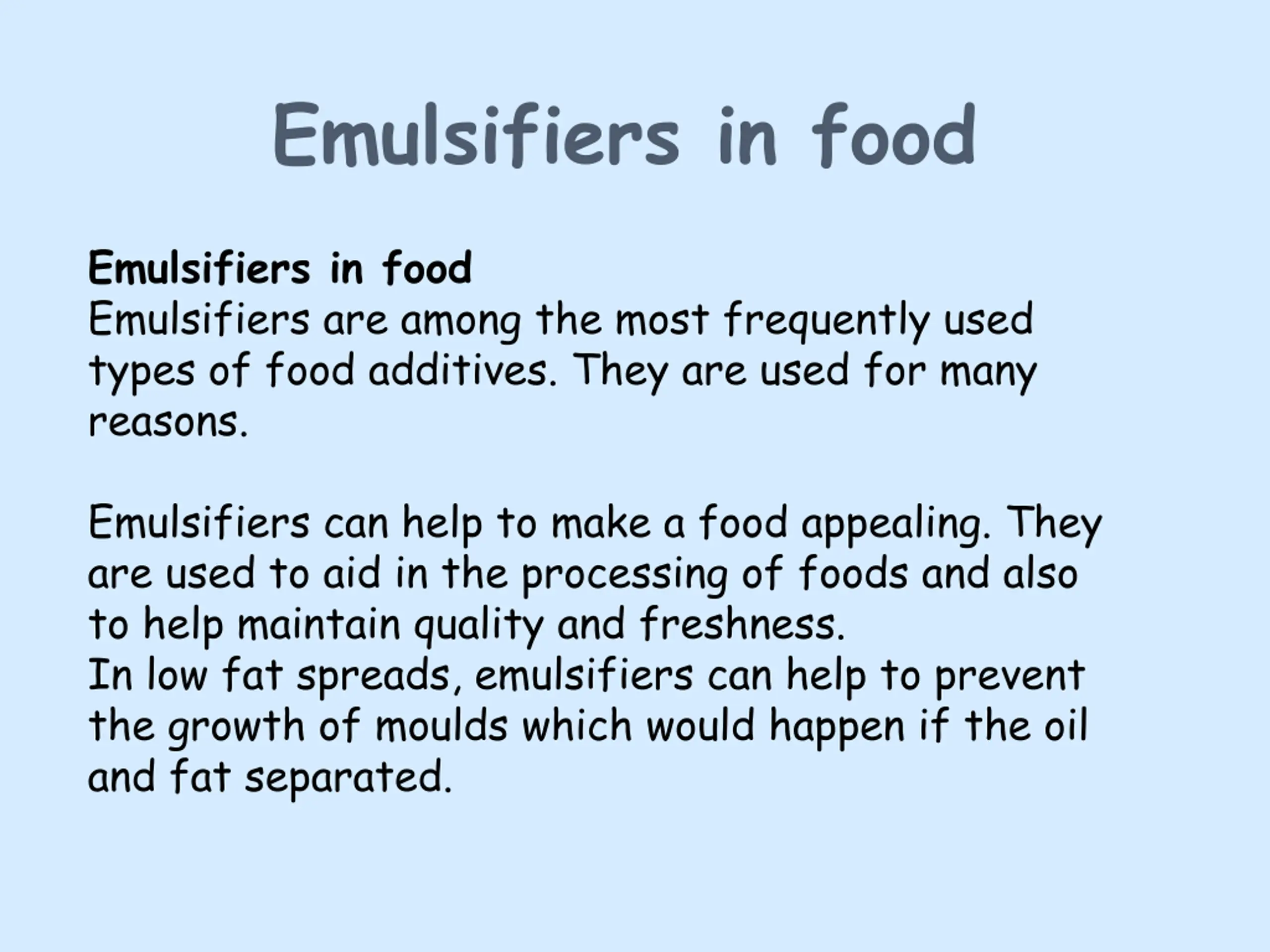Emulsifiers in food Emulsifiers in food Emulsifiers are among the most frequently used types of food additives. They are used for many reasons. Emulsifiers can help to make a food appealing. They are used to aid in the processing of foods and also to help maintain quality and freshness. In low fat spreads, emulsifiers can help to prevent the growth of moulds which would happen if the oil and fat separated.