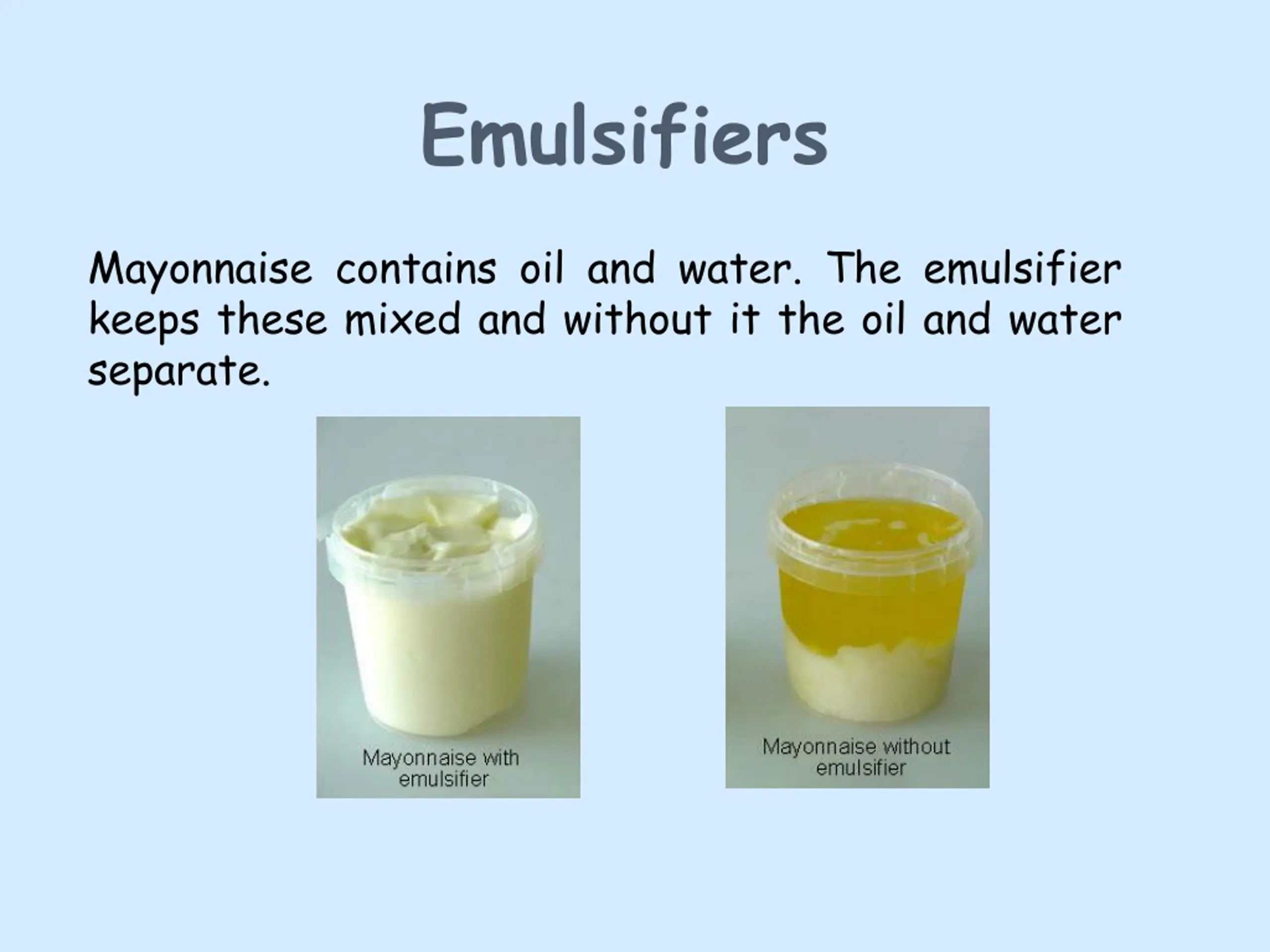 Emulsifiers Mayonnaise contains oil and water. The emulsifier keeps these mixed and without it the oil and water separate. The oil and water separate in mayonnaise without emulsifier. The oil and water separate in mayonnaise without emulsifier.