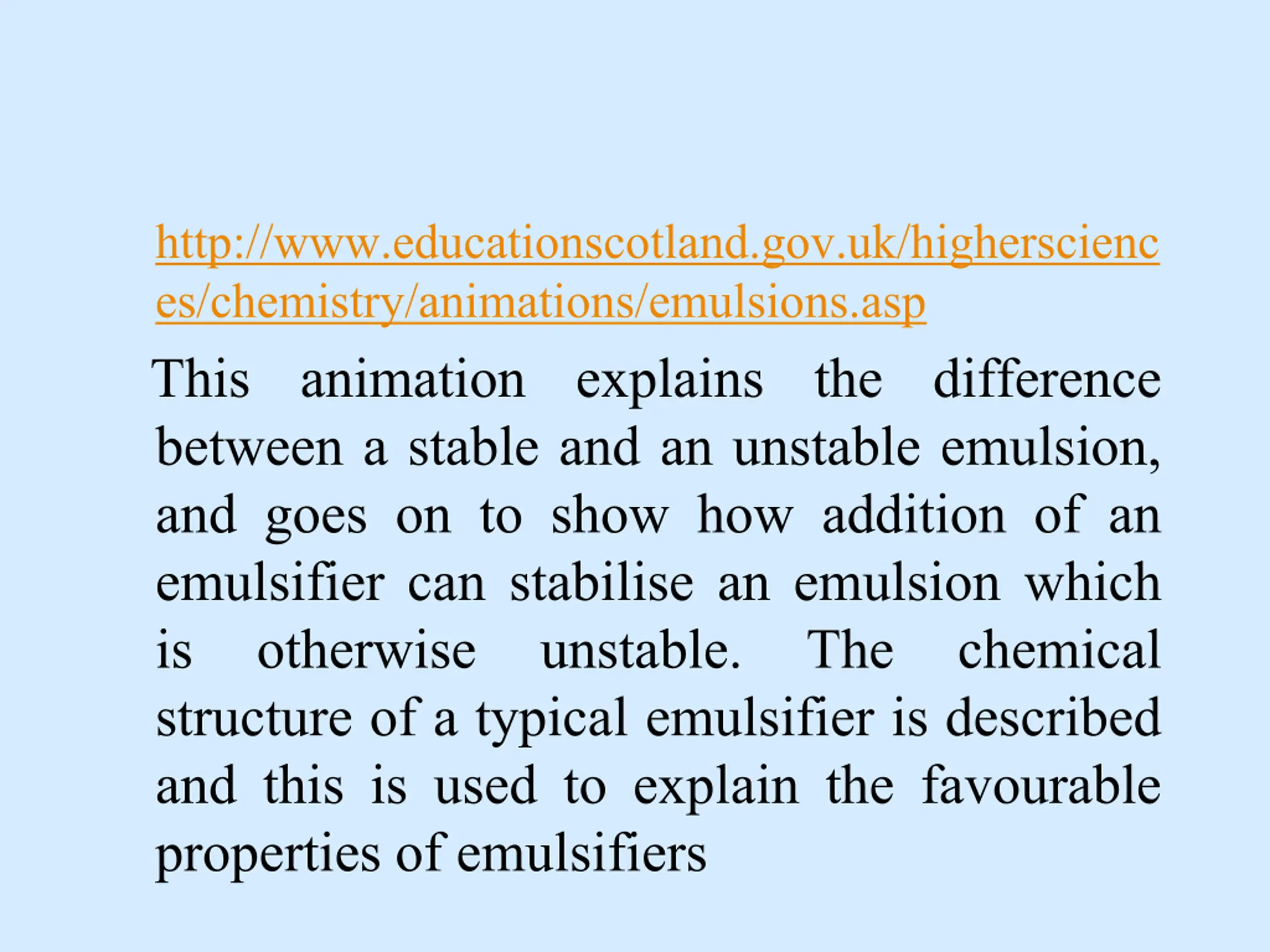 http://www.educationscotland.gov.uk/higherscienc es/chemistry/animations/emulsions.asp This animation explains the difference between a stable and an unstable emulsion, and goes on to show how addition of an emulsifier can stabilise an emulsion which is otherwise unstable. The chemical structure of a typical emulsifier is described and this is used to explain the favourable properties of emulsifiers