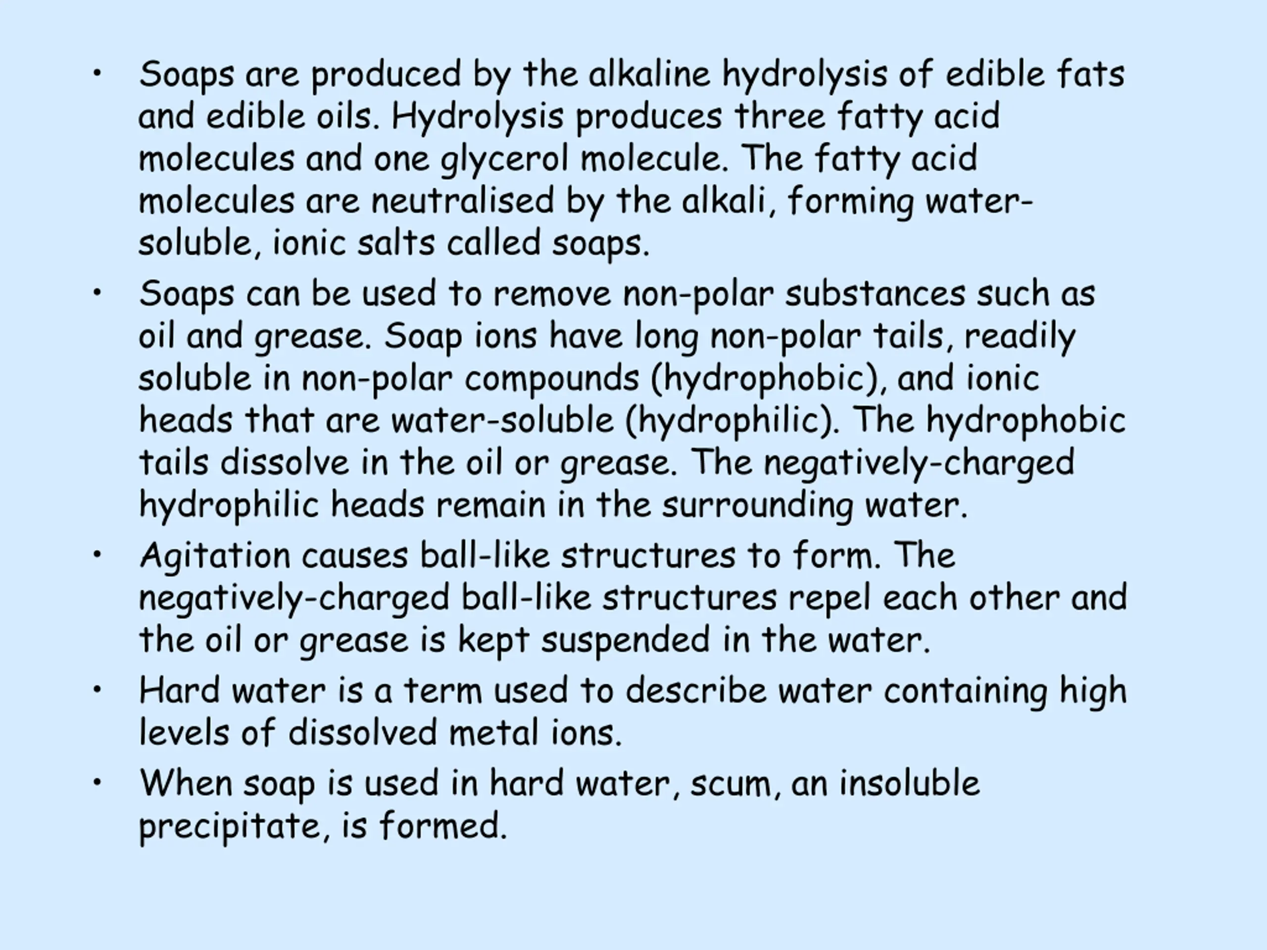 Soaps are produced by the alkaline hydrolysis of edible fats and edible oils. Hydrolysis produces three fatty acid molecules and one glycerol molecule. The fatty acid molecules are neutralised by the alkali, forming water- soluble, ionic salts called soaps. Soaps can be used to remove non-polar substances such as oil and grease. Soap ions have long non-polar tails, readily soluble in non-polar compounds (hydrophobic), and ionic heads that are water-soluble (hydrophilic). The hydrophobic tails dissolve in the oil or grease. The negatively-charged hydrophilic heads remain in the surrounding water. Agitation causes ball-like structures to form. The negatively-charged ball-like structures repel each other and the oil or grease is kept suspended in the water. Hard water is a term used to describe water containing high levels of dissolved metal ions. When soap is used in hard water, scum, an insoluble precipitate, is formed.