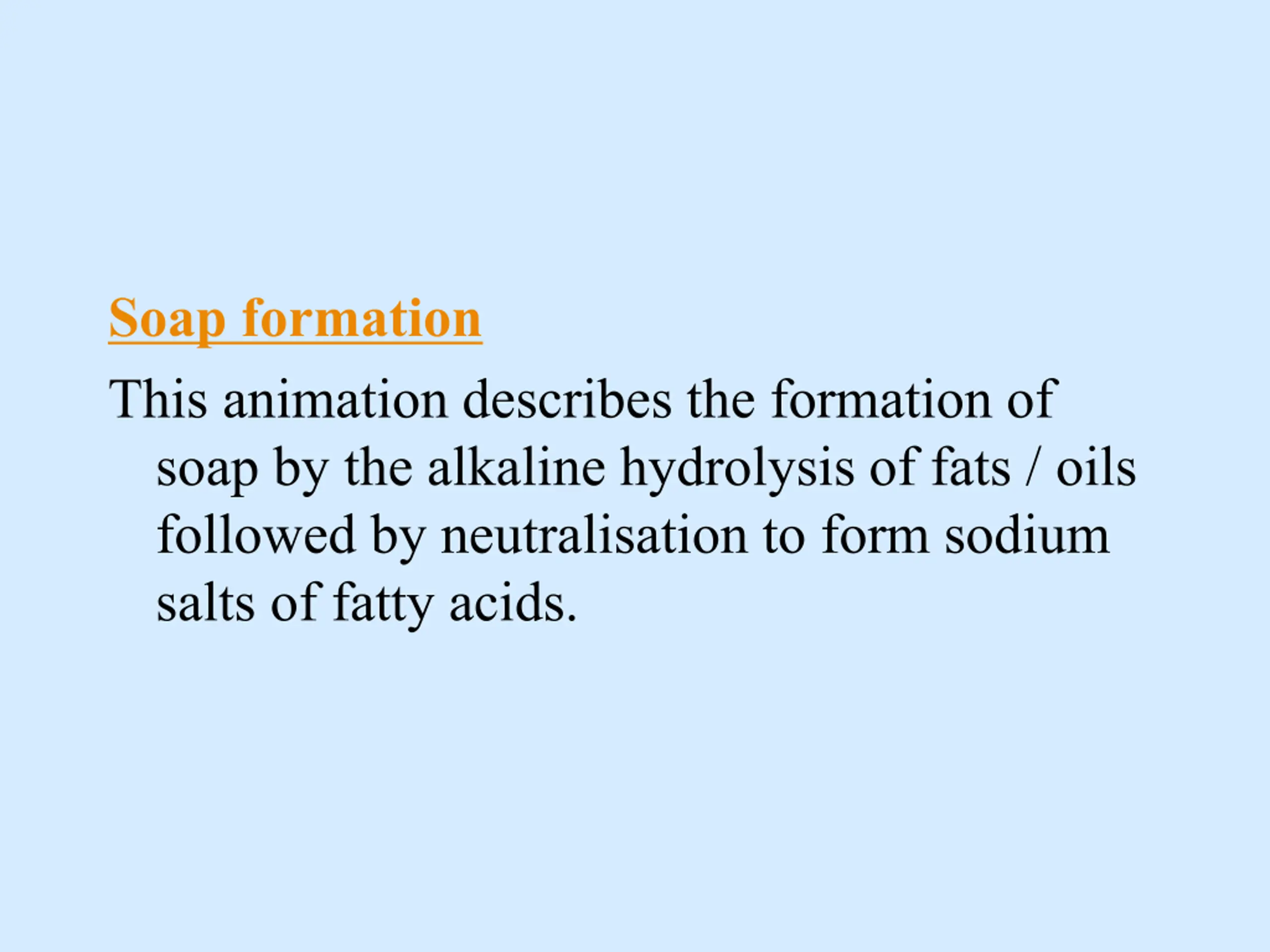 Soap formation This animation describes the formation of soap by the alkaline hydrolysis of fats / oils followed by neutralisation to form sodium salts of fatty acids.