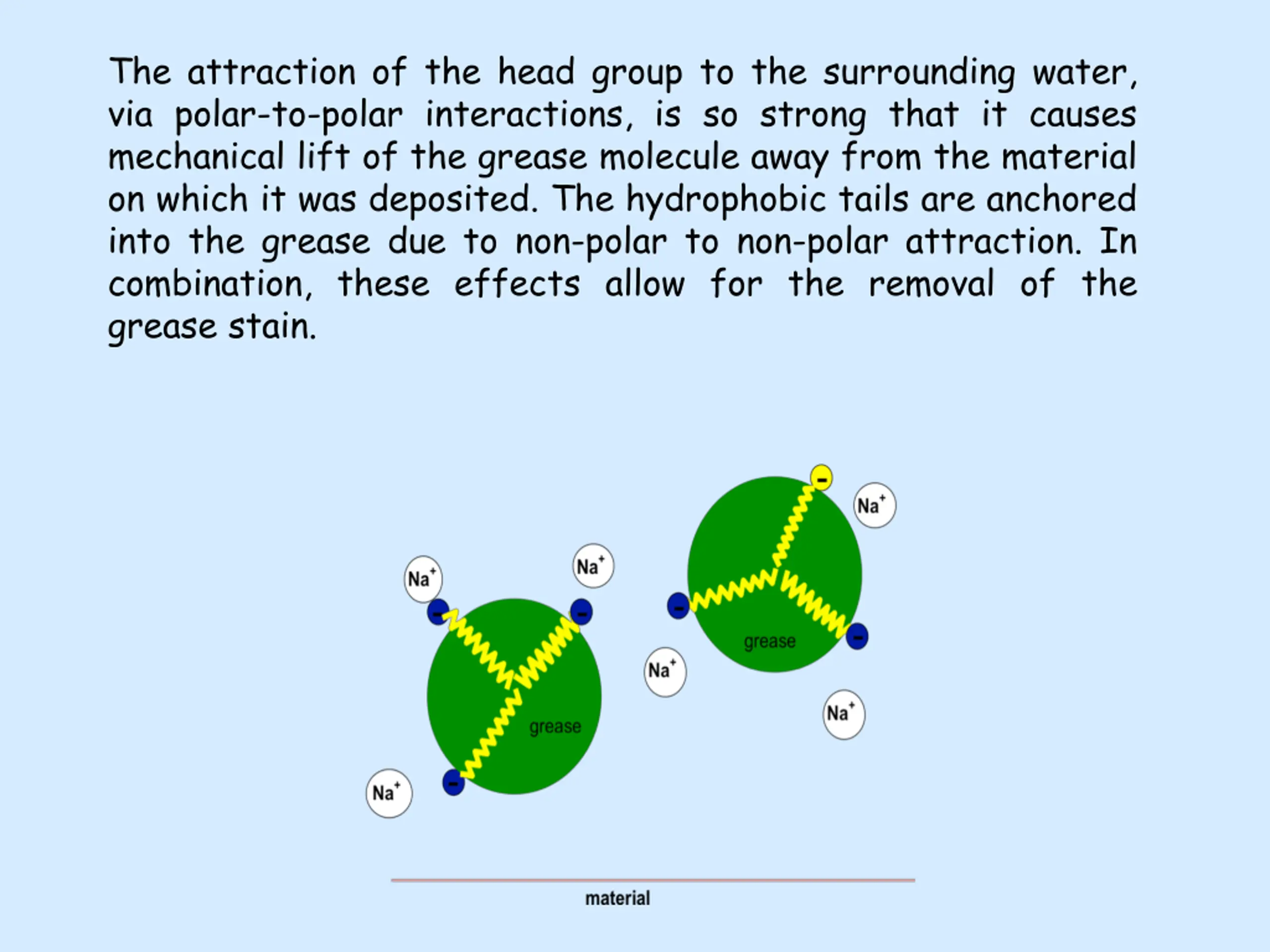 The attraction of the head group to the surrounding water, via polar-to-polar interactions, is so strong that it causes mechanical lift of the grease molecule away from the material on which it was deposited. The hydrophobic tails are anchored into the grease due to non-polar to non-polar attraction. In combination, these effects allow for the removal of the grease stain.