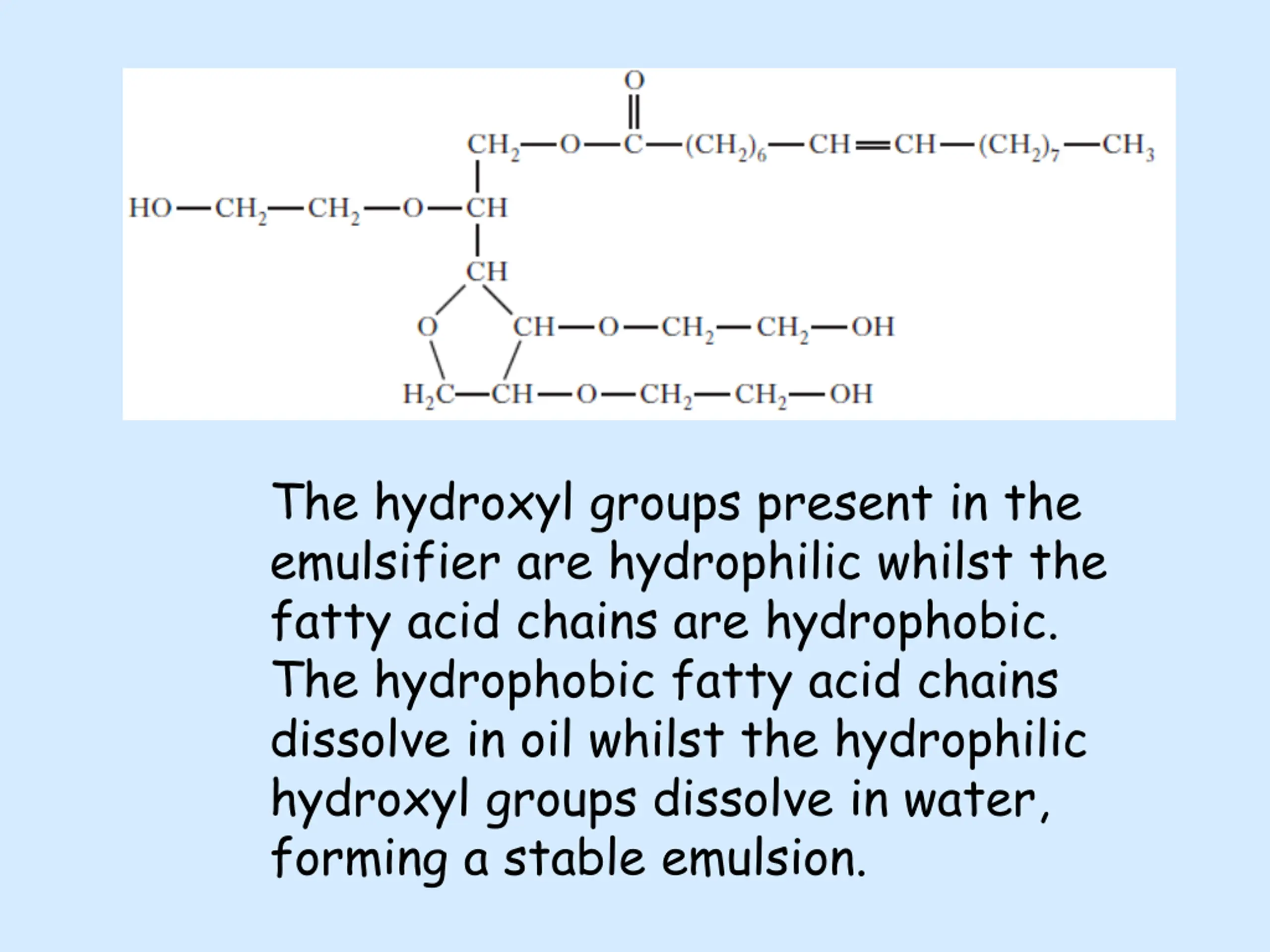 The hydroxyl groups present in the emulsifier are hydrophilic whilst the fatty acid chains are hydrophobic. The hydrophobic fatty acid chains dissolve in oil whilst the hydrophilic hydroxyl groups dissolve in water, forming a stable emulsion.