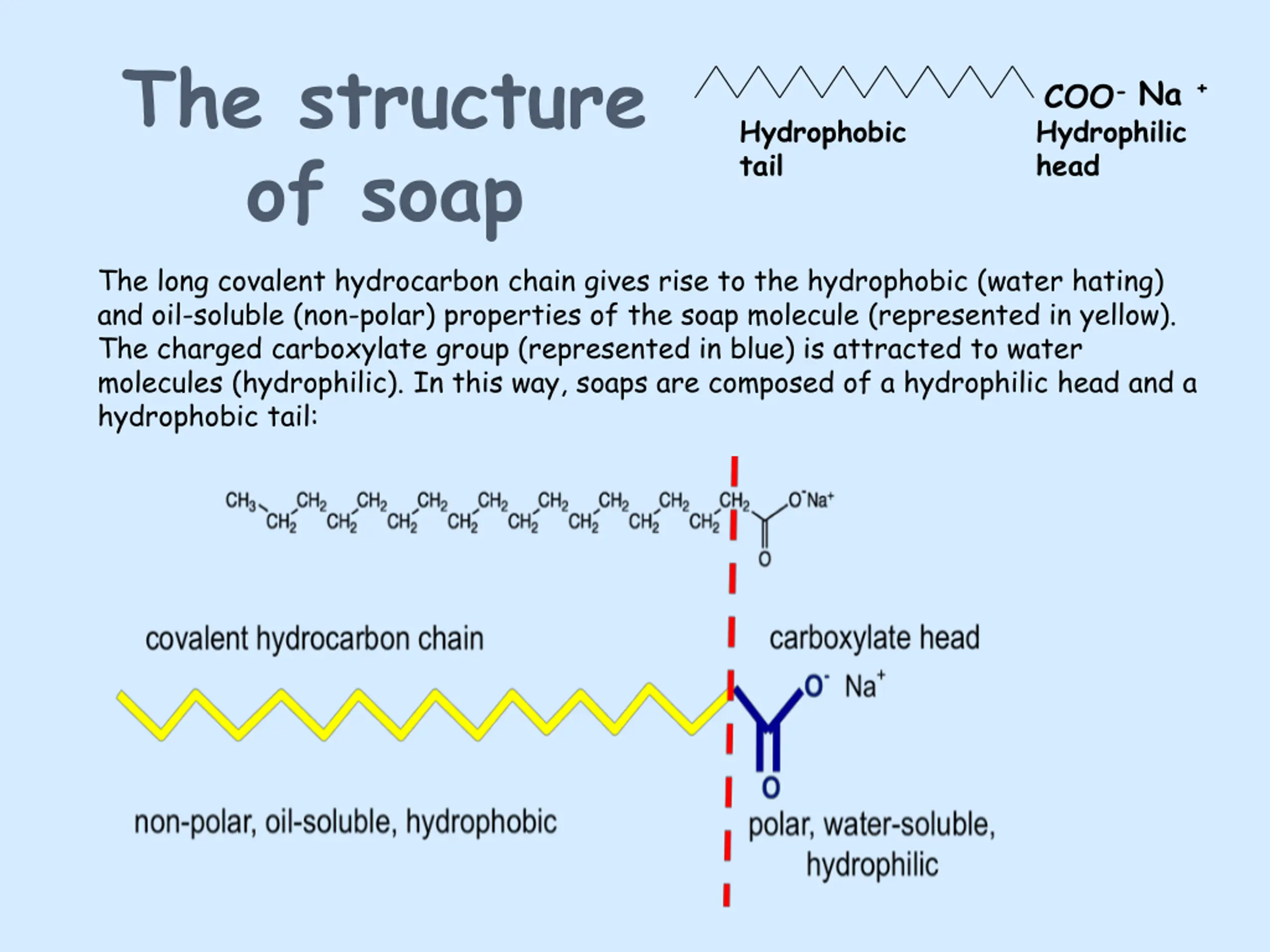 The structure of soap COO-Na + Hydrophilic head Hydrophobic tail The long covalent hydrocarbon chain gives rise to the hydrophobic (water hating) and oil-soluble (non-polar) properties of the soap molecule (represented in yellow). The charged carboxylate group (represented in blue) is attracted to water molecules (hydrophilic). In this way, soaps are composed of a hydrophilic head and a hydrophobic tail: