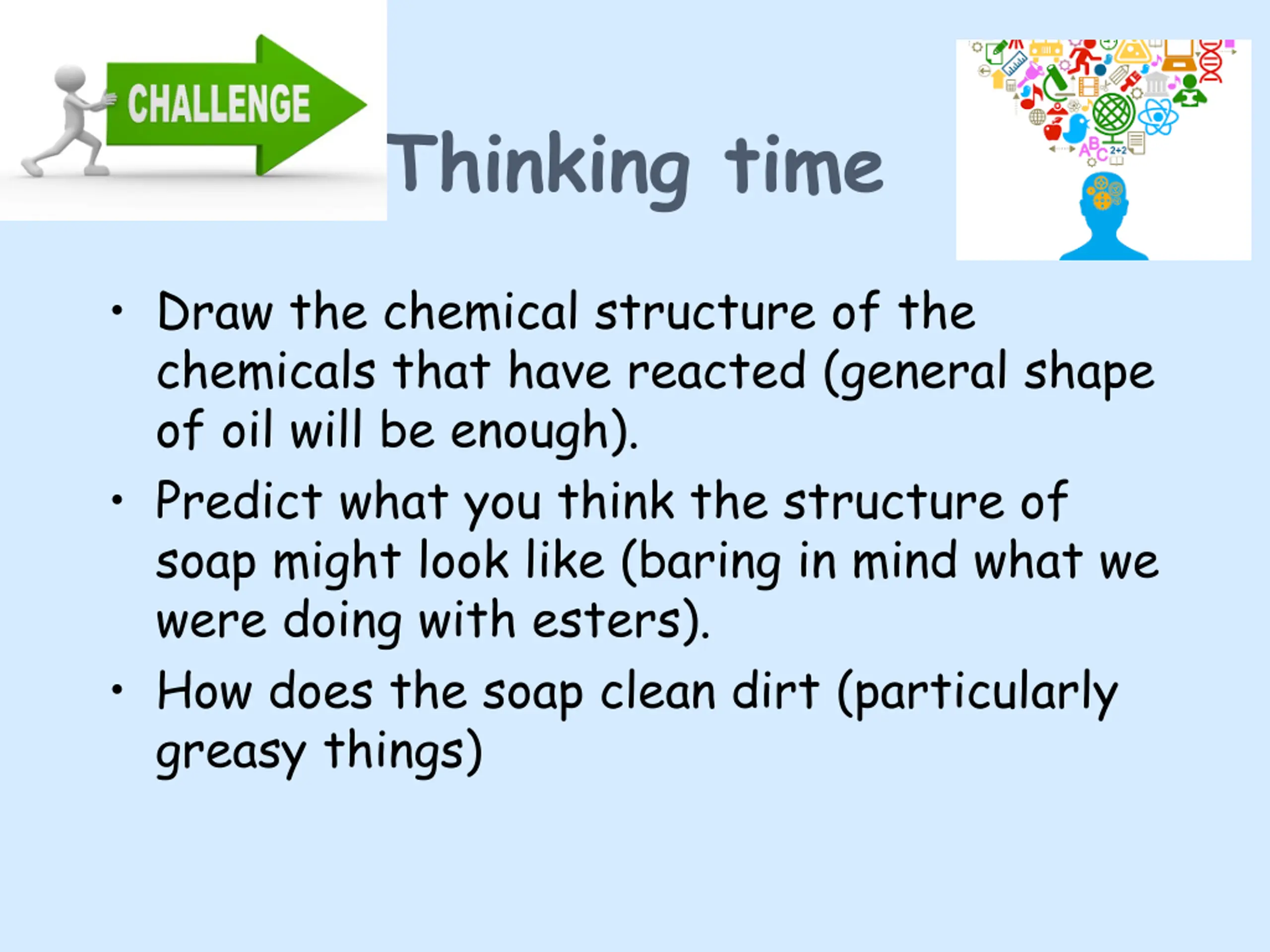 Thinking time Draw the chemical structure of the chemicals that have reacted (general shape of oil will be enough). Predict what you think the structure of soap might look like (baring in mind what we were doing with esters). How does the soap clean dirt (particularly greasy things)