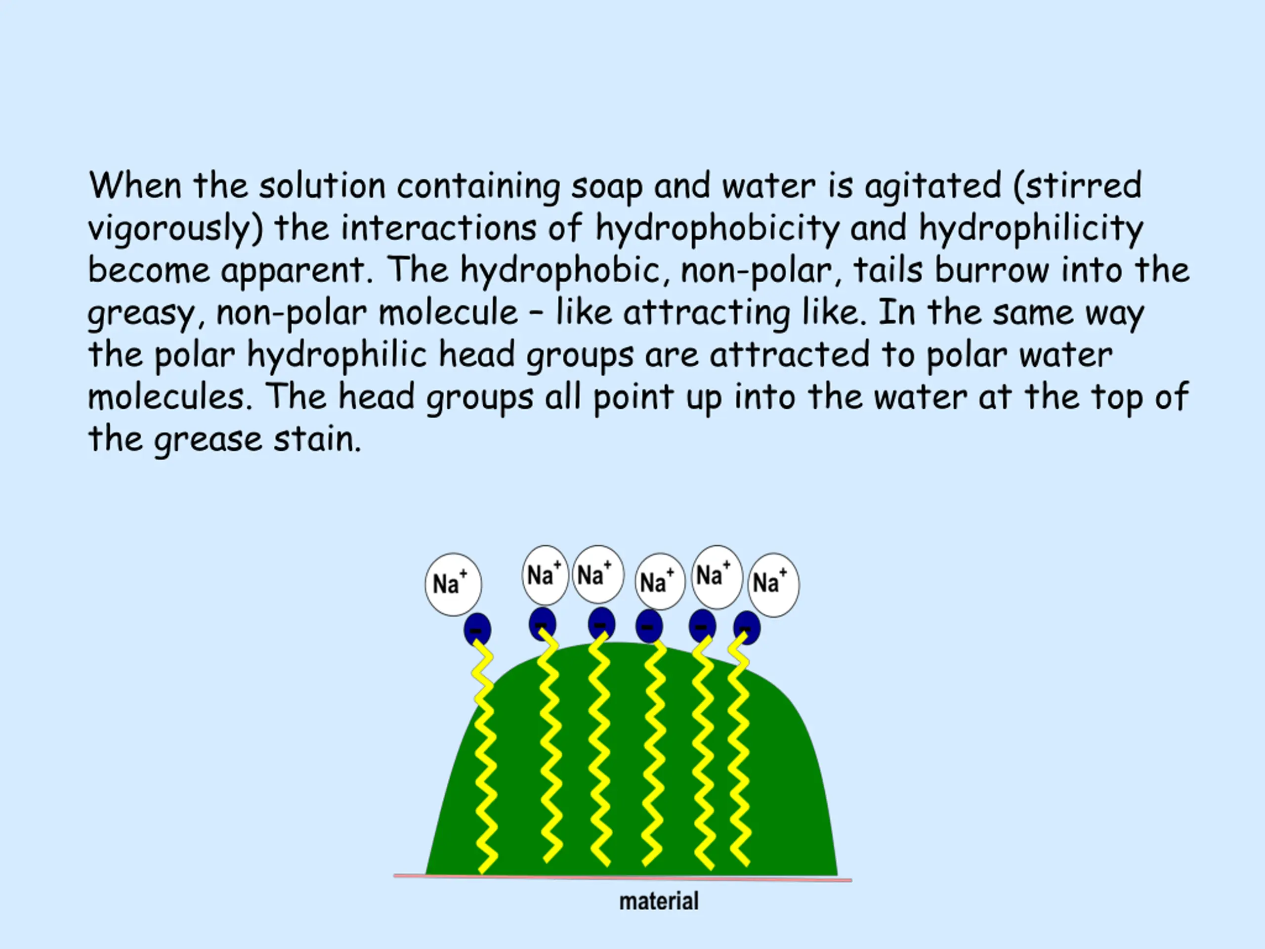 When the solution containing soap and water is agitated (stirred vigorously) the interactions of hydrophobicity and hydrophilicity become apparent. The hydrophobic, non-polar, tails burrow into the greasy, non-polar molecule like attracting like. In the same way the polar hydrophilic head groups are attracted to polar water molecules. The head groups all point up into the water at the top of the grease stain.