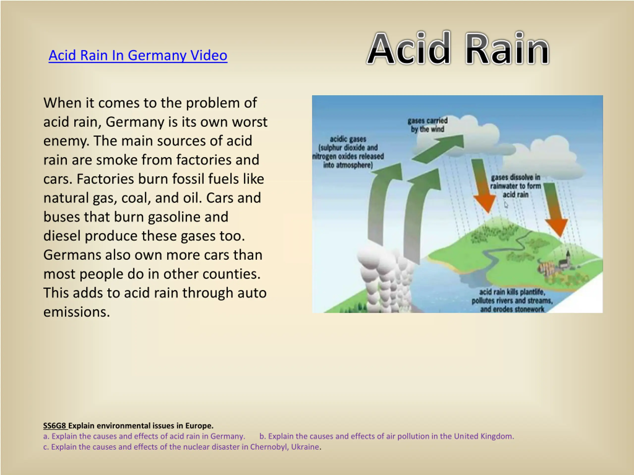 Acid Rain Acid Rain In Germany Video When it comes to the problem of acid rain, Germany is its own worst enemy. The main sources of acid rain are smoke from factories and cars. Factories burn fossil fuels like natural gas, coal, and oil. Cars and buses that burn gasoline and diesel produce these gases too. Germans also own more cars than most people do in other counties. This adds to acid rain through auto emissions. SS6G8 Explain environmental issues in Europe. a. Explain the causes and effects of acid rain in Germany. b. Explain the causes and effects of air pollution in the United Kingdom. c. Explain the causes and effects of the nuclear disaster in Chernobyl, Ukraine.