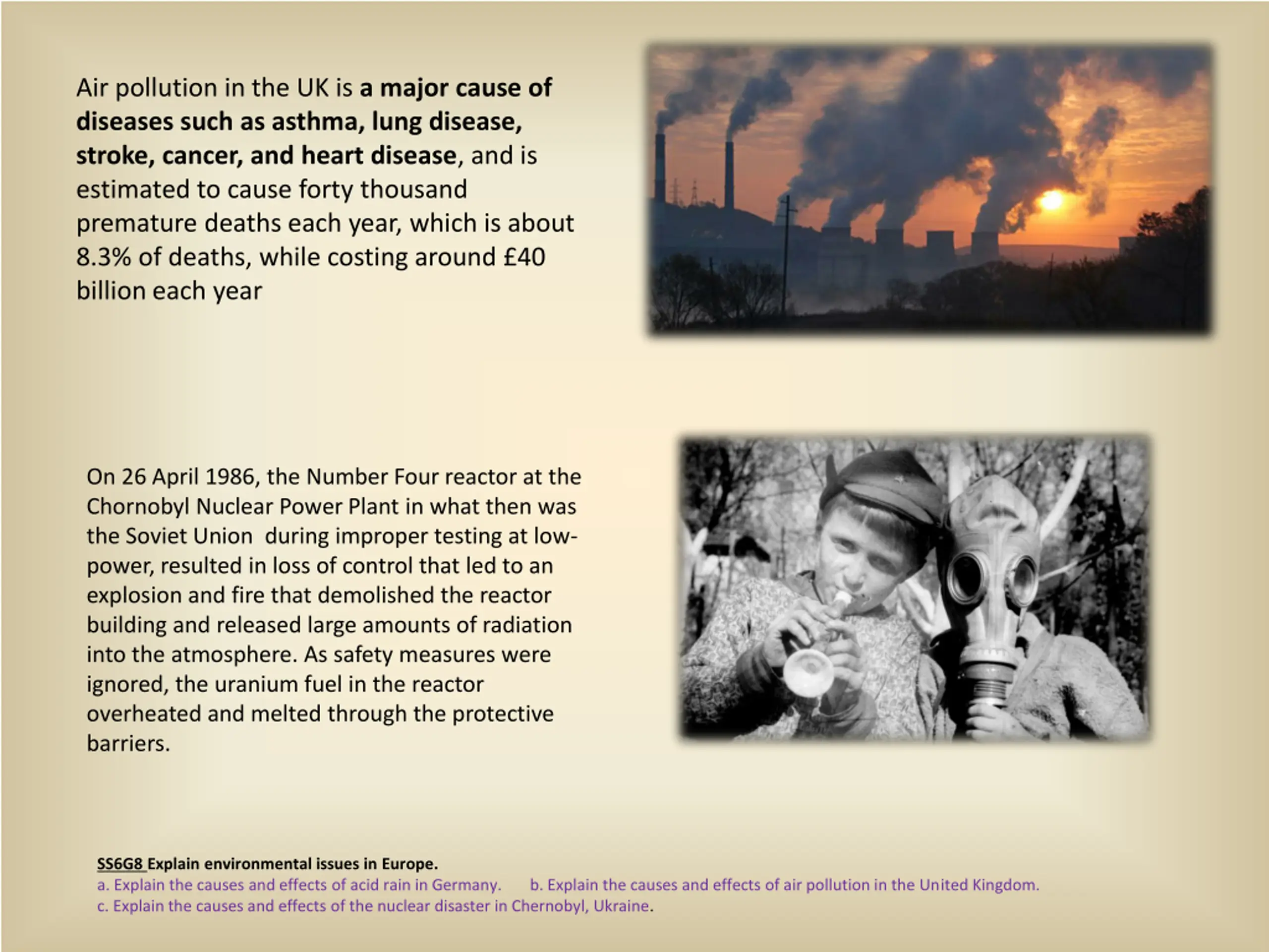 Air pollution in the UK is a major cause of diseases such as asthma, lung disease, stroke, cancer, and heart disease, and is estimated to cause forty thousand premature deaths each year, which is about 8.3% of deaths, while costing around 40 billion each year On 26 April 1986, the Number Four reactor at the Chornobyl Nuclear Power Plant in what then was the Soviet Union during improper testing at low- power, resulted in loss of control that led to an explosion and fire that demolished the reactor building and released large amounts of radiation into the atmosphere. As safety measures were ignored, the uranium fuel in the reactor overheated and melted through the protective barriers. SS6G8 Explain environmental issues in Europe. a. Explain the causes and effects of acid rain in Germany. b. Explain the causes and effects of air pollution in the United Kingdom. c. Explain the causes and effects of the nuclear disaster in Chernobyl, Ukraine.