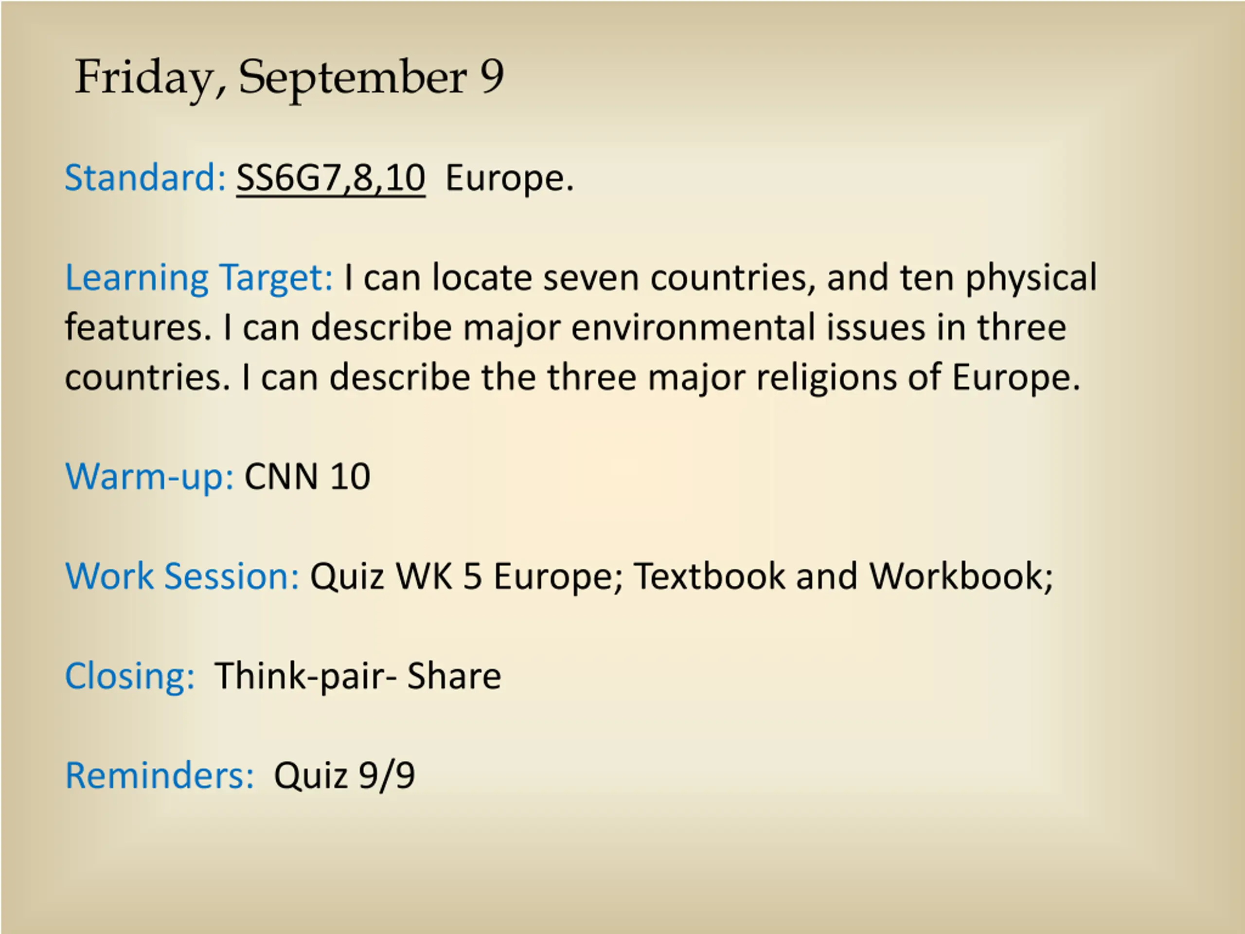 Friday, September 9 Standard: SS6G7,8,10 Europe. Learning Target: I can locate seven countries, and ten physical features. I can describe major environmental issues in three countries. I can describe the three major religions of Europe. Warm-up: CNN 10 Work Session: Quiz WK 5 Europe; Textbook and Workbook; Closing: Think-pair- Share Reminders: Quiz 9/9