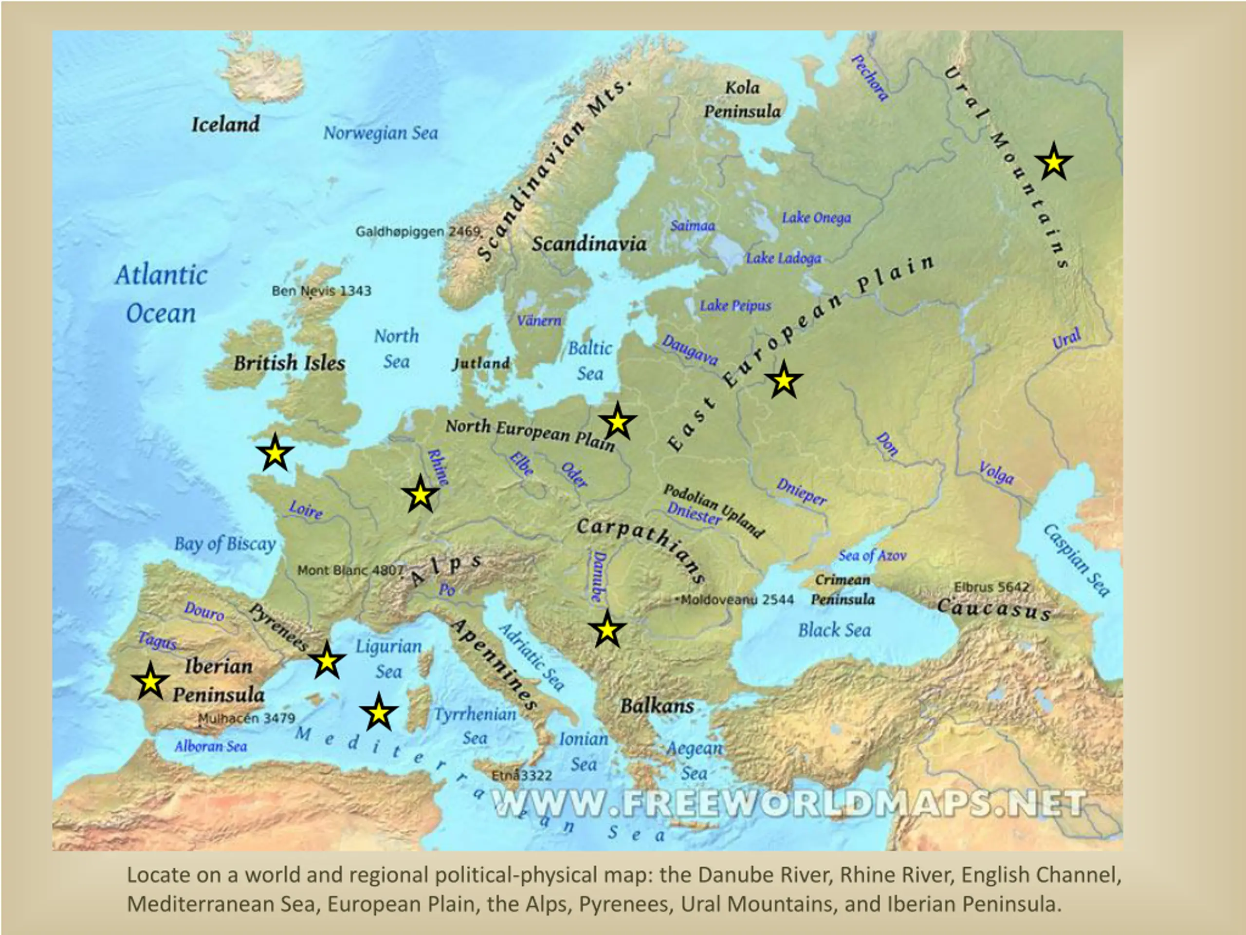 Locate on a world and regional political-physical map: the Danube River, Rhine River, English Channel, Mediterranean Sea, European Plain, the Alps, Pyrenees, Ural Mountains, and Iberian Peninsula.