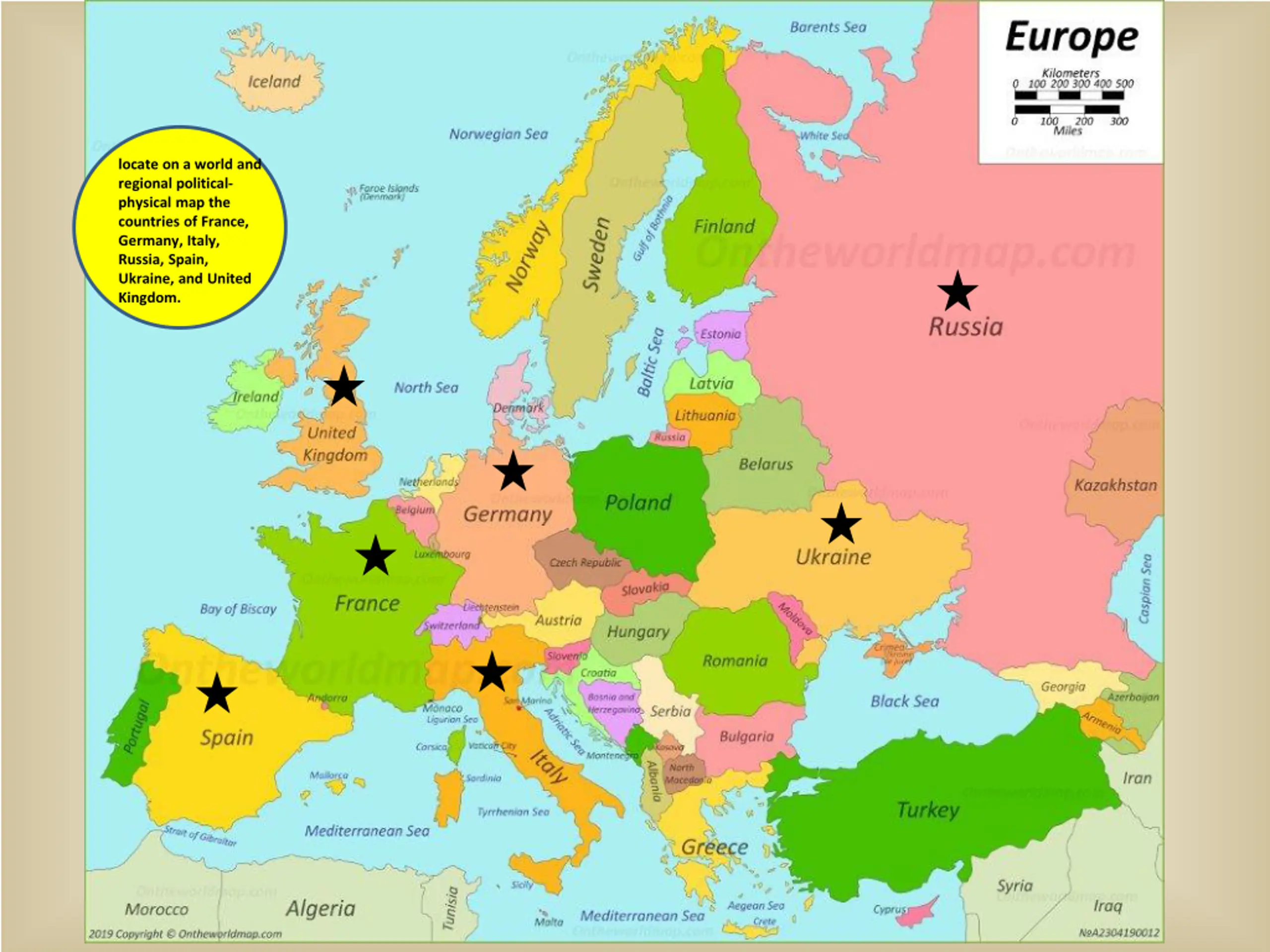 locate on a world and regional political- physical map the countries of France, Germany, Italy, Russia, Spain, Ukraine, and United Kingdom.