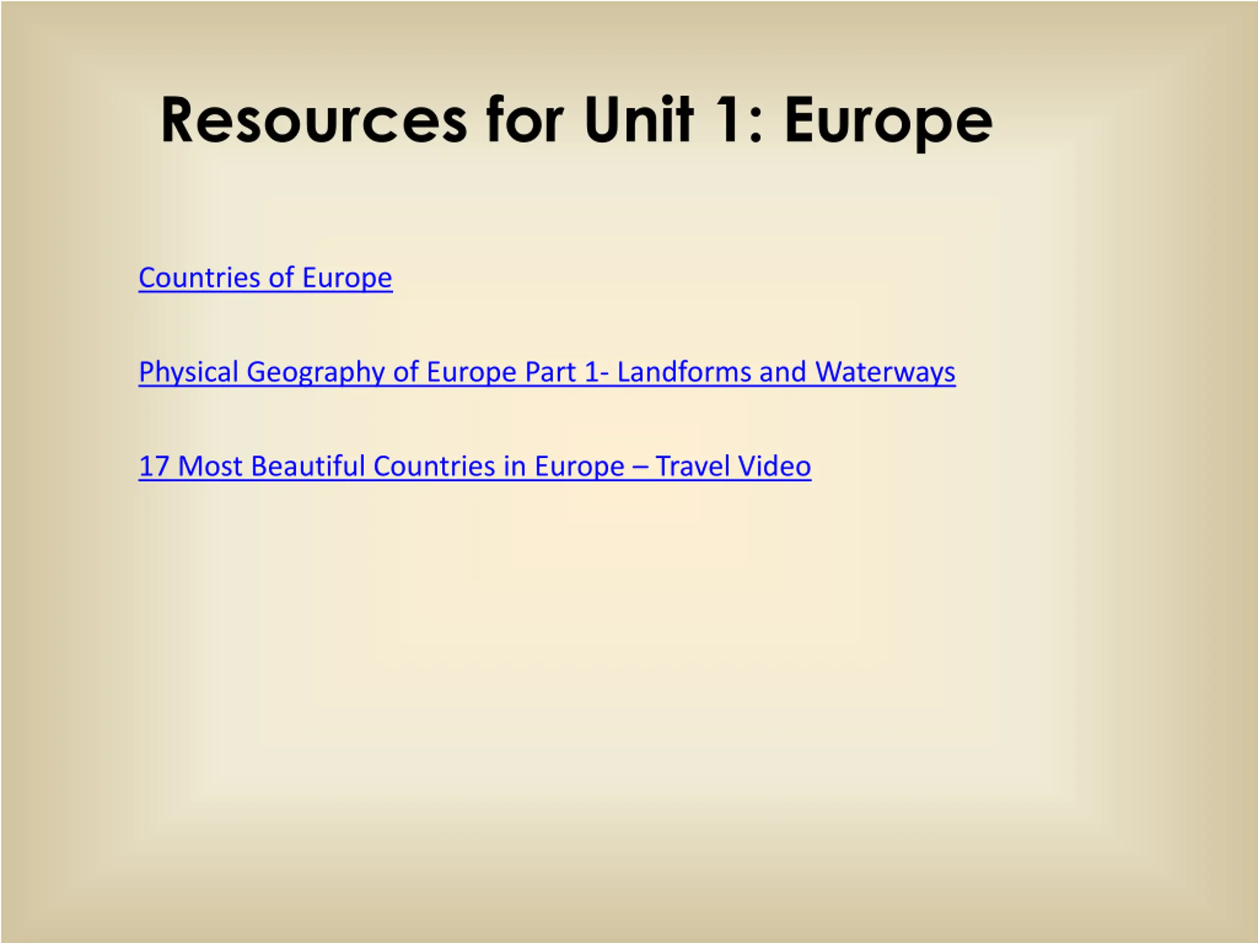 Resources for Unit 1: Europe Countries of Europe Physical Geography of Europe Part 1- Landforms and Waterways 17 Most Beautiful Countries in Europe Travel Video