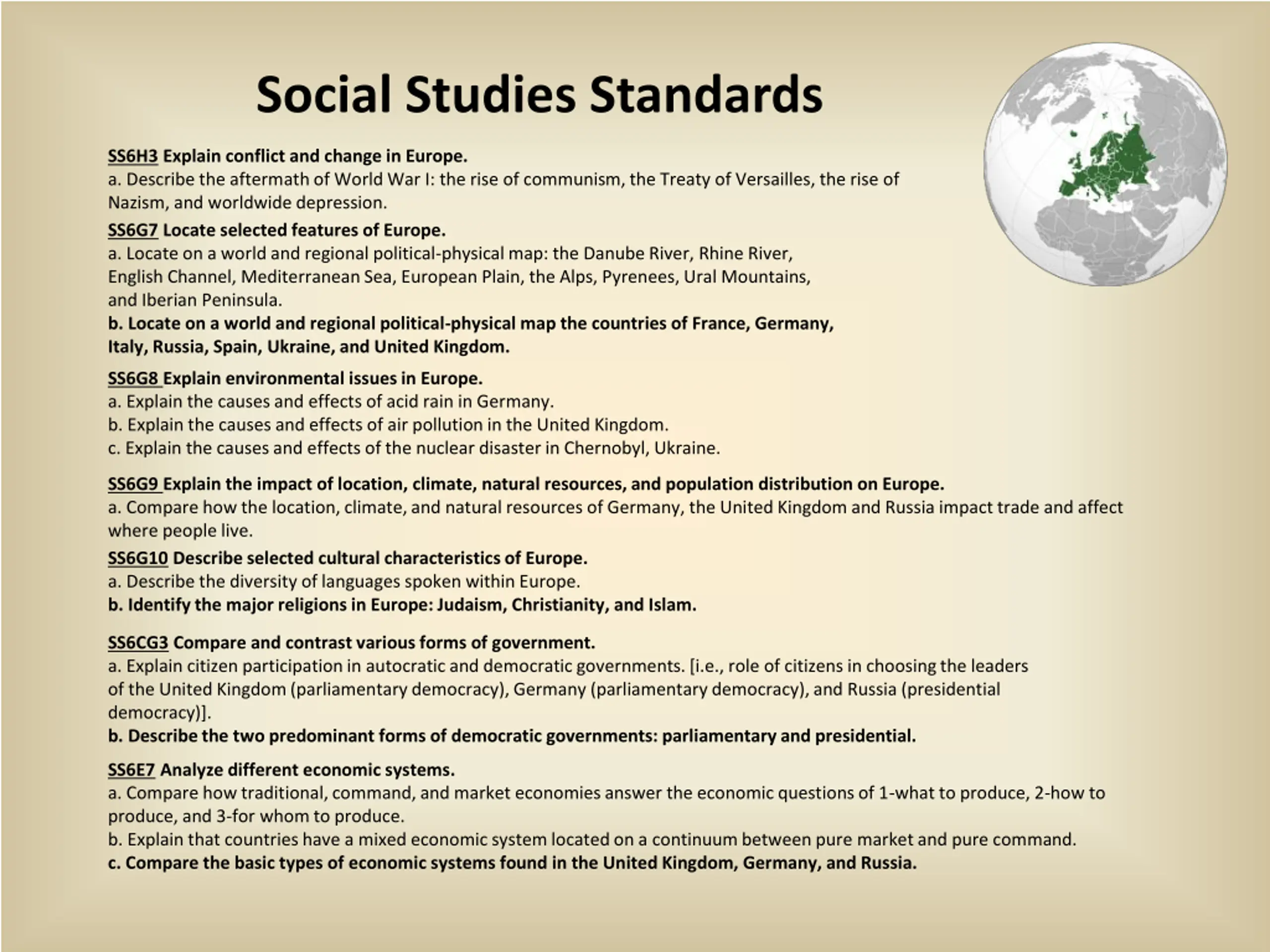 Social Studies Standards SS6H3 Explain conflict and change in Europe. a. Describe the aftermath of World War I: the rise of communism, the Treaty of Versailles, the rise of Nazism, and worldwide depression. SS6G7 Locate selected features of Europe. a. Locate on a world and regional political-physical map: the Danube River, Rhine River, English Channel, Mediterranean Sea, European Plain, the Alps, Pyrenees, Ural Mountains, and Iberian Peninsula. b. Locate on a world and regional political-physical map the countries of France, Germany, Italy, Russia, Spain, Ukraine, and United Kingdom. SS6G8 Explain environmental issues in Europe. a. Explain the causes and effects of acid rain in Germany. b. Explain the causes and effects of air pollution in the United Kingdom. c. Explain the causes and effects of the nuclear disaster in Chernobyl, Ukraine. SS6G9 Explain the impact of location, climate, natural resources, and population distribution on Europe. a. Compare how the location, climate, and natural resources of Germany, the United Kingdom and Russia impact trade and affect where people live. SS6G10 Describe selected cultural characteristics of Europe. a. Describe the diversity of languages spoken within Europe. b. Identify the major religions in Europe: Judaism, Christianity, and Islam. SS6CG3 Compare and contrast various forms of government. a. Explain citizen participation in autocratic and democratic governments. [i.e., role of citizens in choosing the leaders of the United Kingdom (parliamentary democracy), Germany (parliamentary democracy), and Russia (presidential democracy)]. b. Describe the two predominant forms of democratic governments: parliamentary and presidential. SS6E7 Analyze different economic systems. a. Compare how traditional, command, and market economies answer the economic questions of 1-what to produce, 2-how to produce, and 3-for whom to produce. b. Explain that countries have a mixed economic system located on a continuum between pure market and pure command. c. Compare the basic types of economic systems found in the United Kingdom, Germany, and Russia.